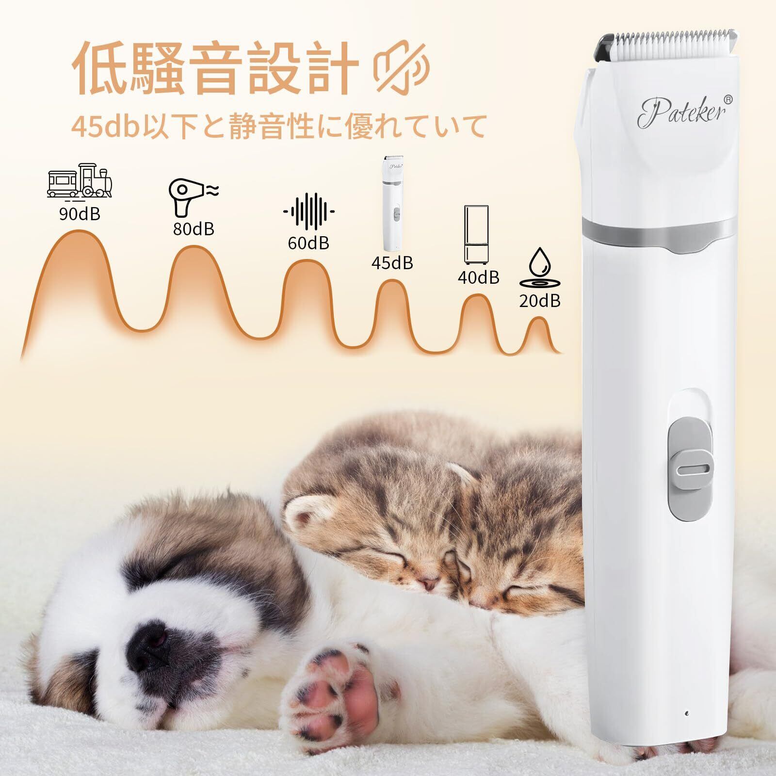 【動物救命士監修】【4in1多機能ペットバリカン】Pateker 犬 バリカンは、全身、局部、足裏、爪研ぎのための4つの交換可能な刃を備えており。この犬用バリカンは犬、猫などの小動物の全身、足、顔、耳周りの毛をカットするのに適しています。4つのガイドコーム(3mm/3mm/6mm/10mm)が付属しており、毛の長さを簡単に調整できます。軽量で、低コストでプロのカット効果を家庭で手軽に楽しむことができます。ペットのケアを1台のツールで完了したいユーザーに最適です。