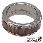HawaiiのNewブランドalameaのコアウッド&チタンのリングです。ハワイアンコアウッドの温もりとチタンの輝きが高級な雰囲気をだしています。両サイドには波のデザインが彫り込まれたセンスを感じさせるリングです。チタンは非常に硬いので傷つきにくく変色も起こさないので扱いやすくなっています。