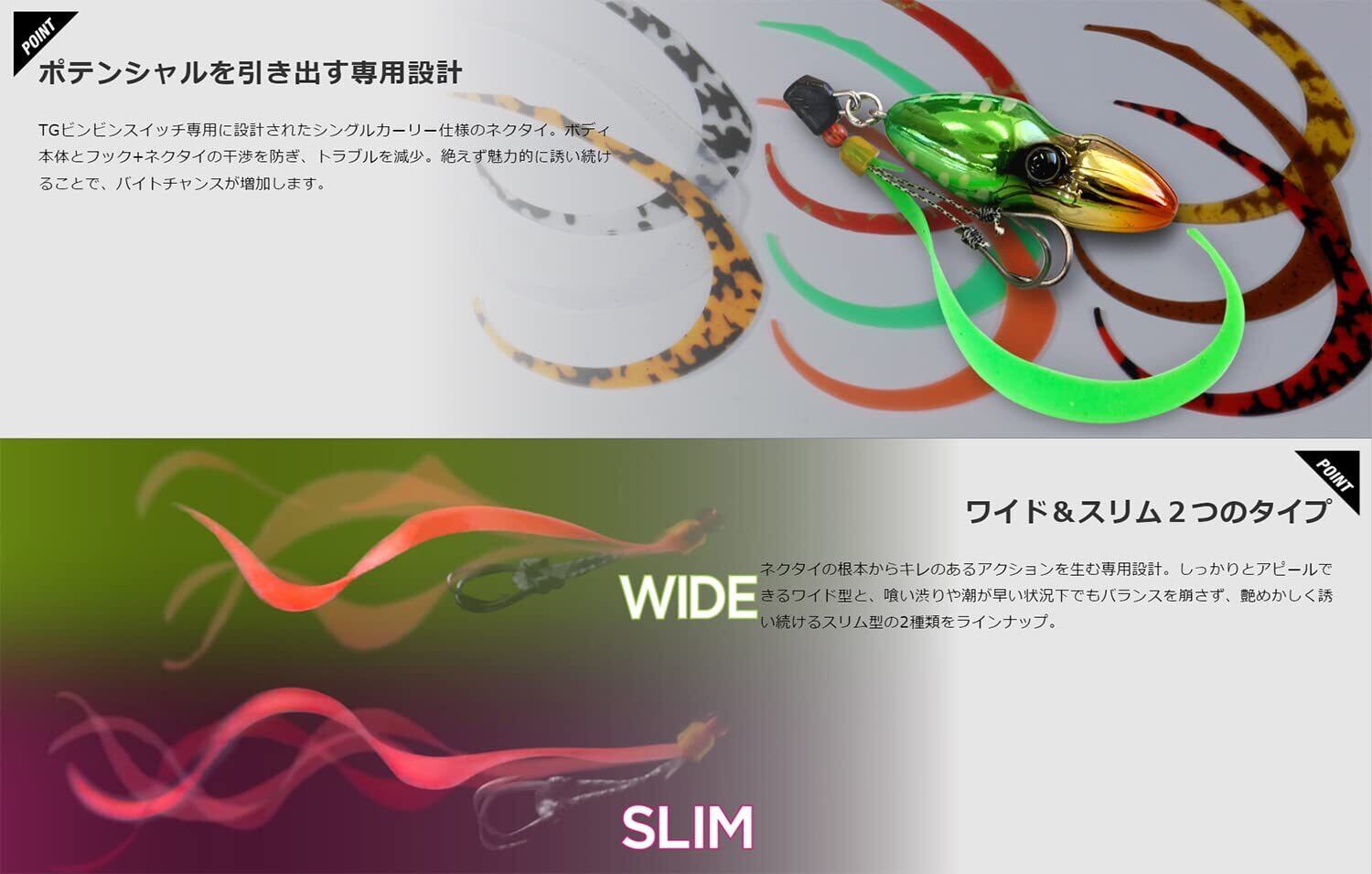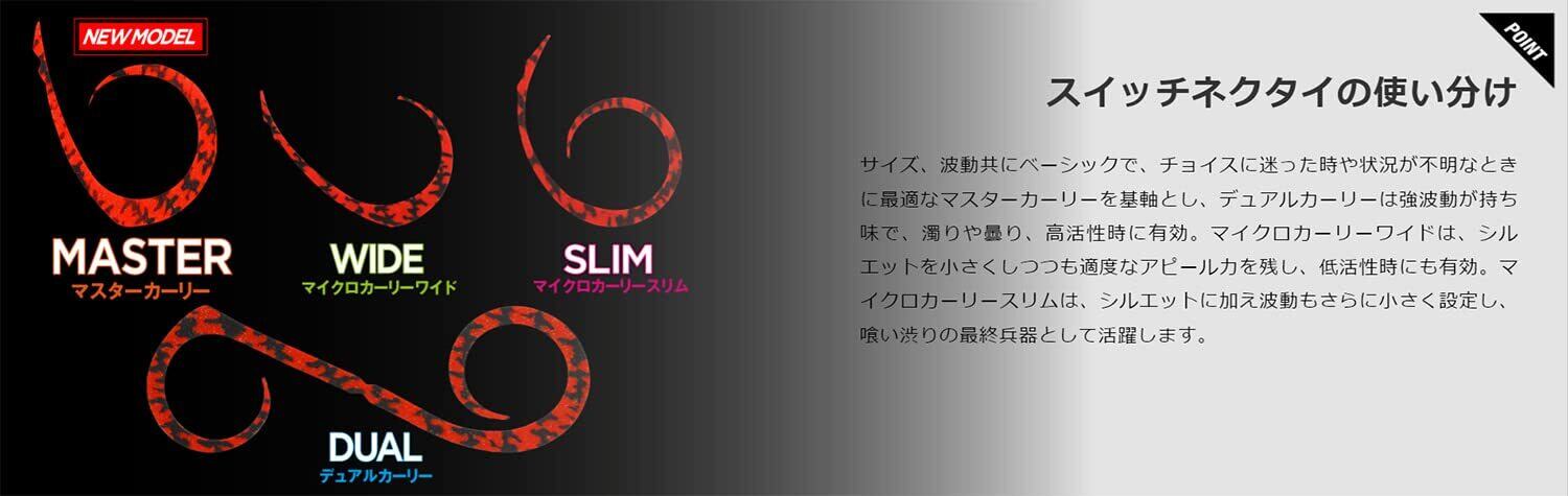 しっかりとアピールできるワイド型と、喰い渋りや潮が早い状況下でもバランスを崩さず、艶めかしく誘い続けるスリム型の2種類をラインナップ!