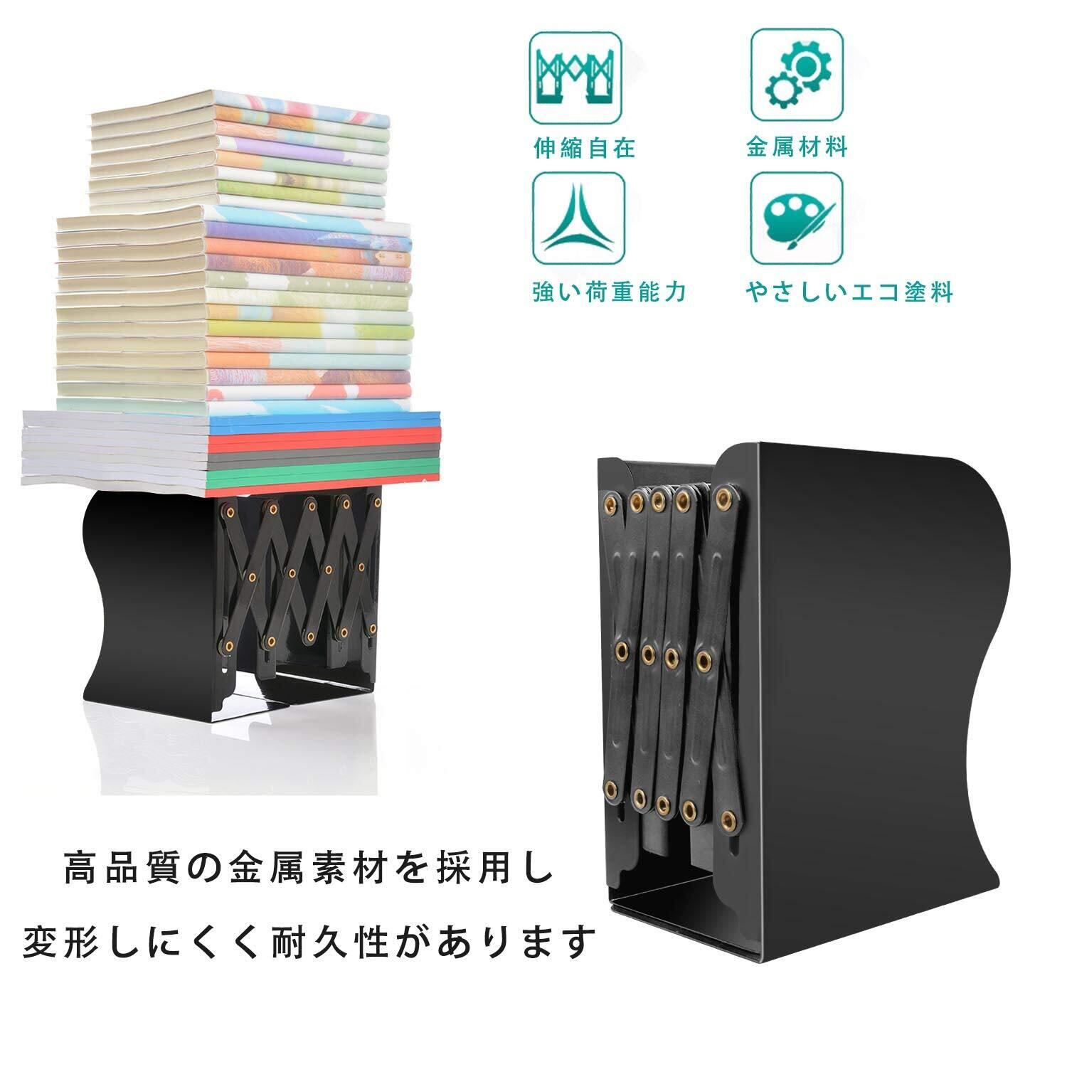 伸縮可能なブックエンド:50cmまで伸縮できます、本の数によって幅が自由に調整していただけます。二重仕切りがあるので、本の種類によって簡単に分類して、取り出しも便利です。