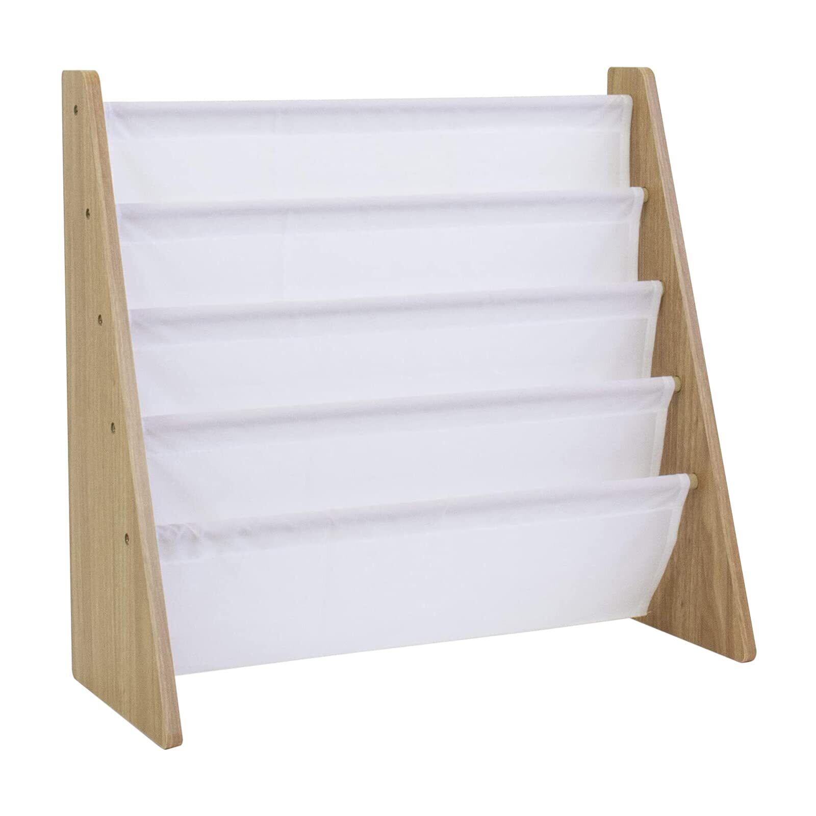 省スペースで4段の絵本収納棚は、子どものお気に入りの本のコレクションに適している。本の表紙が前を向くようにディスプレイできるつくりなので、子どもが本を識別し、取り出しやすい。天然木仕上げで、ホワイトの布製収納ポケットが4つあり、さまざまな形やサイズの本や雑誌を収納することができる。インテリアにマッチしやすい、モダンでスタイリッシュなデザイン。丈夫なエンジニアードウッド製で、組み立てやすく、お手入れもスムーズ。組み立て金具付き。組み立て寸法 : 幅64cm x 奥行28cm x 高さ61cm