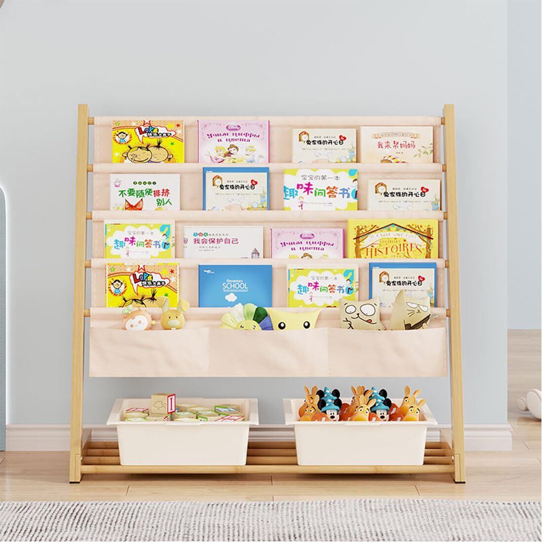 【倒れにくい】:お子様が寄りかかっても倒れにくいL字型設計。フレーム部分は丈夫で耐久性のある天然木材、受け布は本が傷みにくいキャンバス(帆布)生地を使用しています。生地に深みがあるので大きい本・厚みがある本でも収納できます。