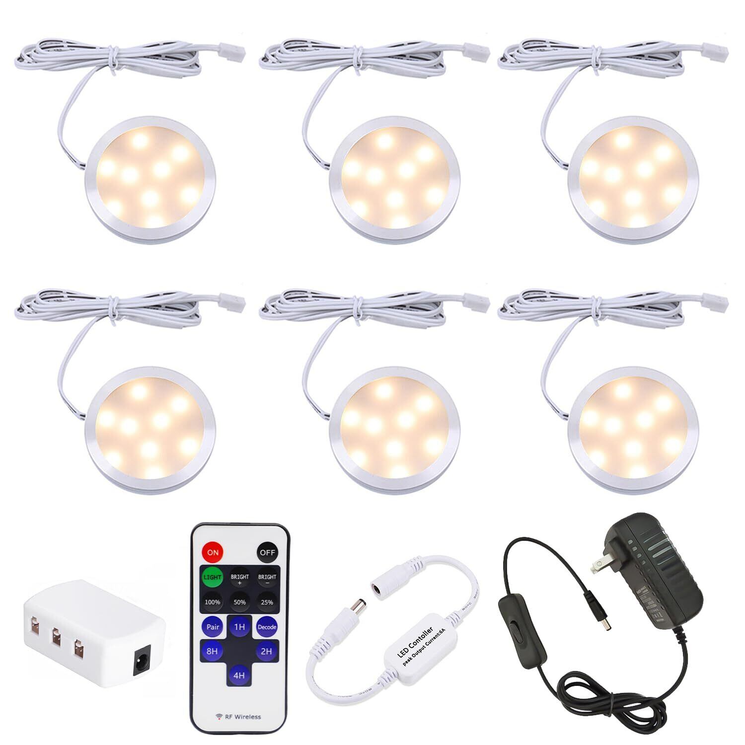 AIBOOキャビネットライトライト 調整可能LED照明 ラジコントロール12 Vプラグインアダプタのスタンド上照明装置 超薄ボールランプ 食器棚 本棚ショーケース ワインキャビネット タンスなどに適用6個セット (昼光色6000K)