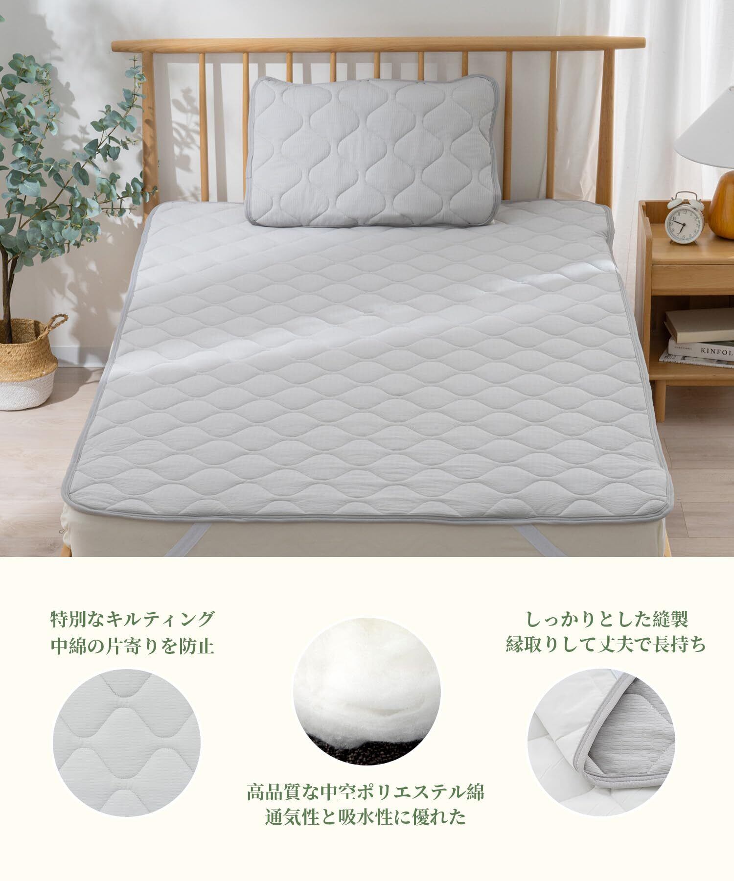 【肌にやさしい】優れた吸水性と通気性を備える素材で織り上げた敷パッドだから、夏にもさっぱり。たっぷり中綿を充填し、ふんわりふっくらな感触をお楽しみいただけます。寒い時期にも温もりを実感していただけます。