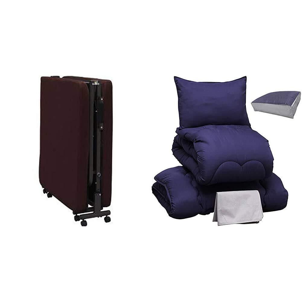 【すぐに使える寝具セット】アイリスオーヤマ ベッド 折りたたみベッド シングル 低反発 14段階リクライニング 完成品 ブラウン + 布団セット シングル 4点セットネイビー