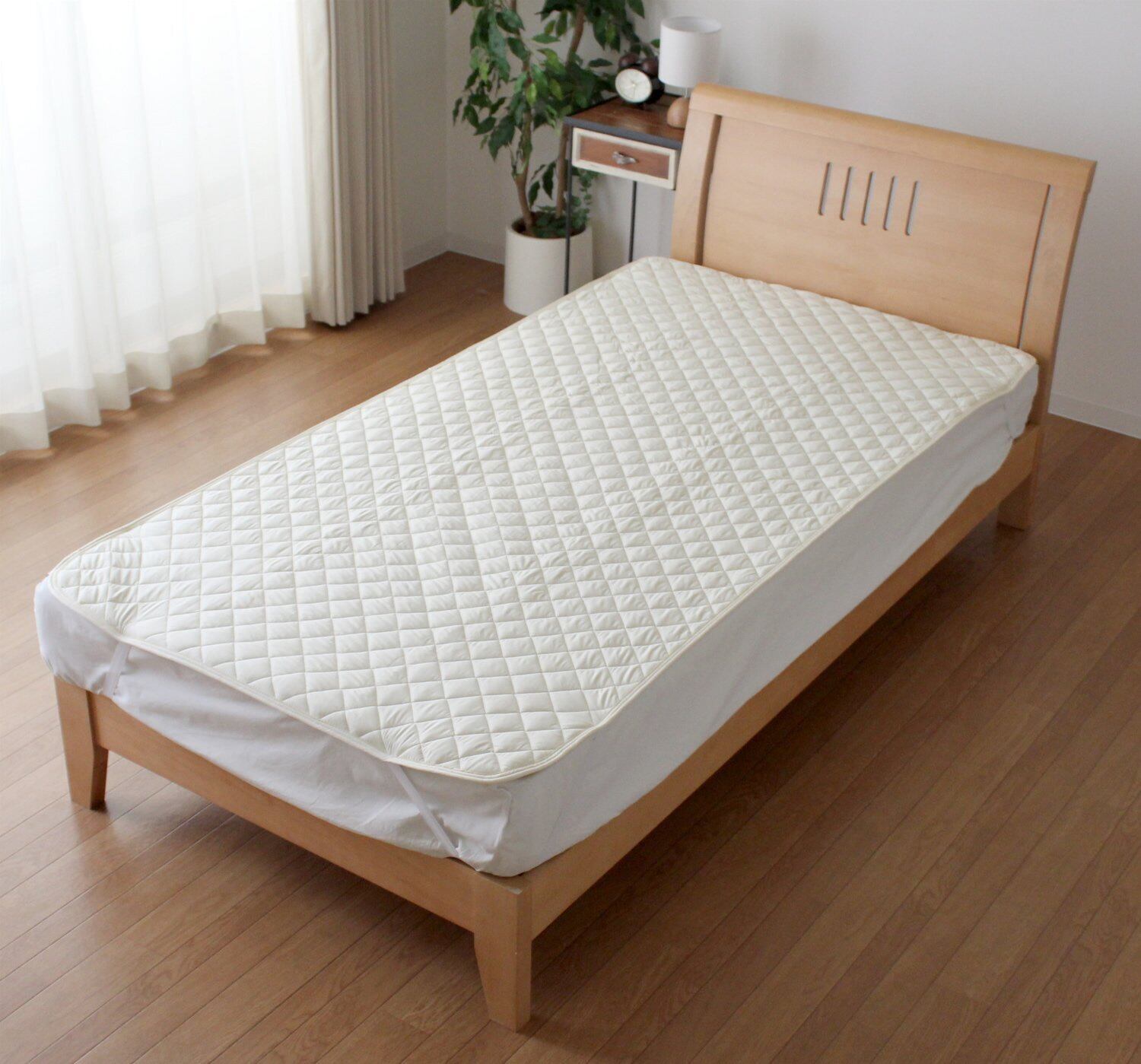 中わた部分に羊毛繊維を混合したベッドパッド。ウールは保温性が高いので冬は暖かく、また空気中の湿気を吸収し、水分が蒸発するときに気化熱を奪うため夏は涼しく感じます。ベッドパッド自体も洗濯でき清潔、衛生的に使用できる。