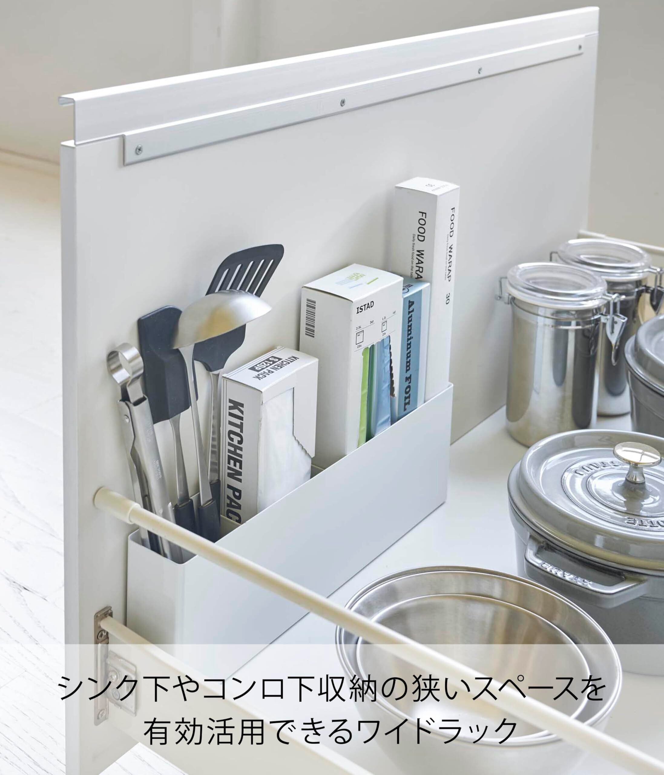 シンク下やコンロ下の収納の狭いスペースを有効活用!ラップやポリ袋などのボックス類、キッチンツール・まな板などを一括収納!置くだけの簡単設置。