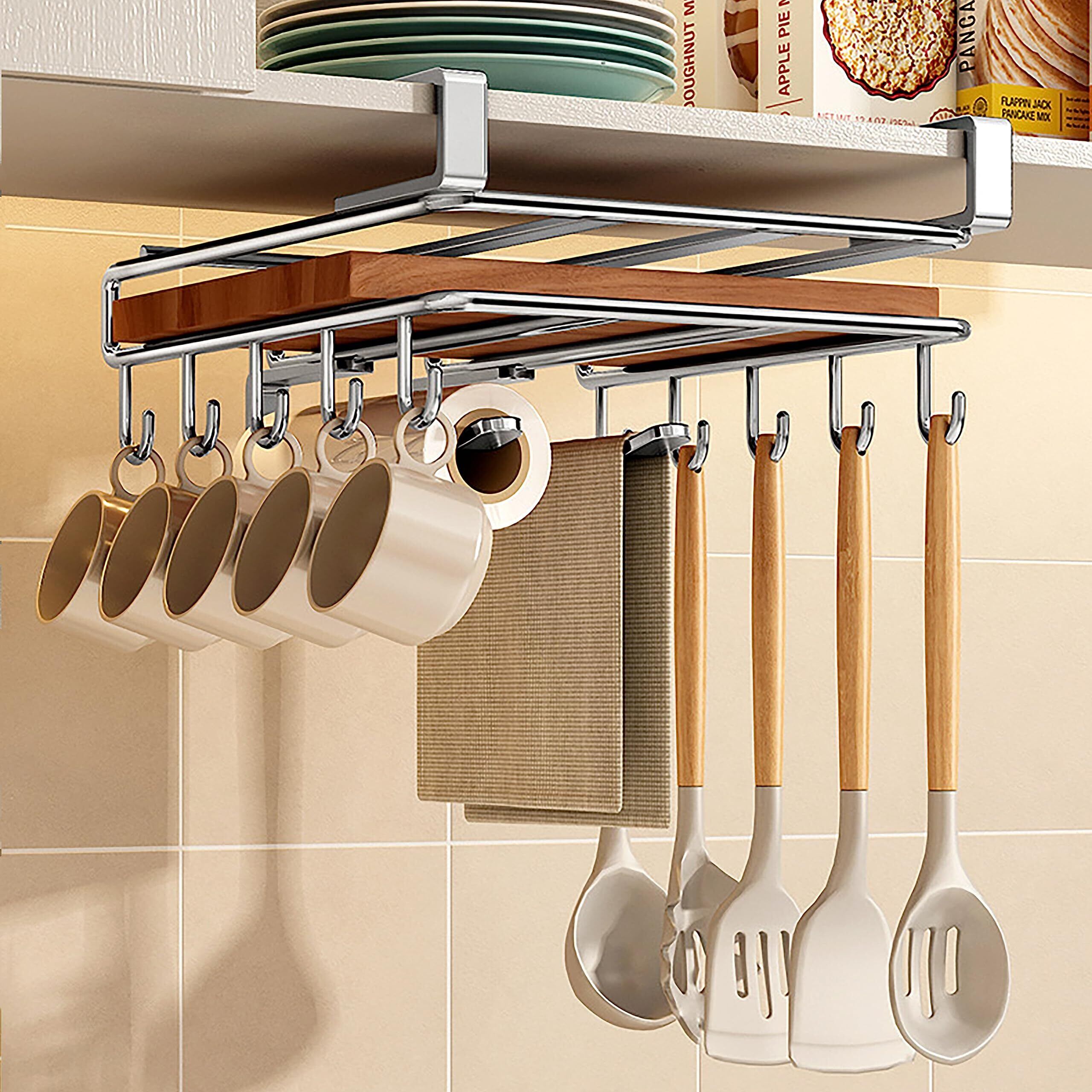 【多機能収納】この吊戸棚下ラックは10つのフックと2つのバーを付き、キッチンの布巾・キッチンペーパーホルダー・カップなどの小物を一括に収納できます。