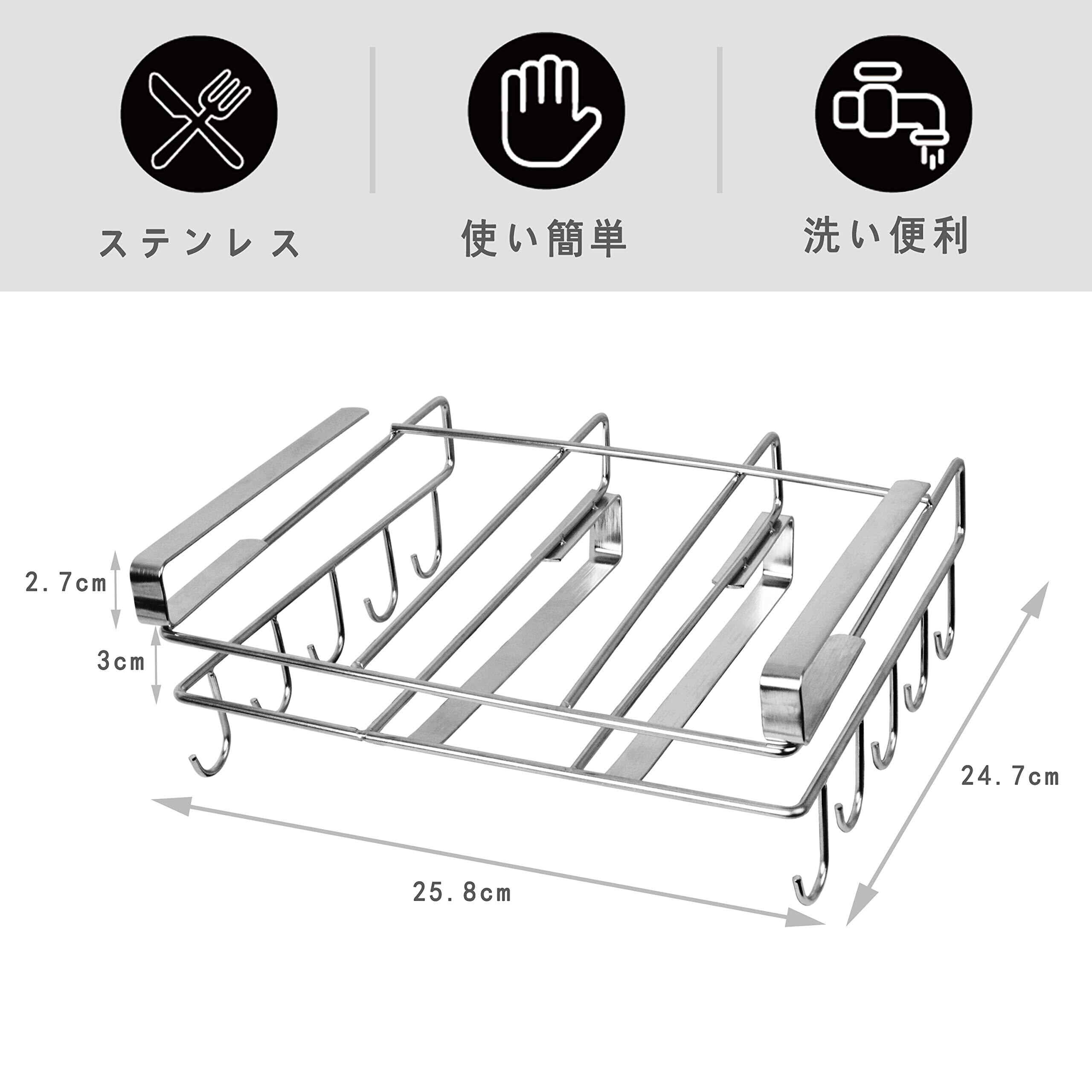 【商品仕様】サイズ:26.5*25*10CM 材質:ステンレス鋼 耐荷重:10kg 取付可能な吊り下げ戸棚:棚板の厚さ約1.5~2cmまでに対応