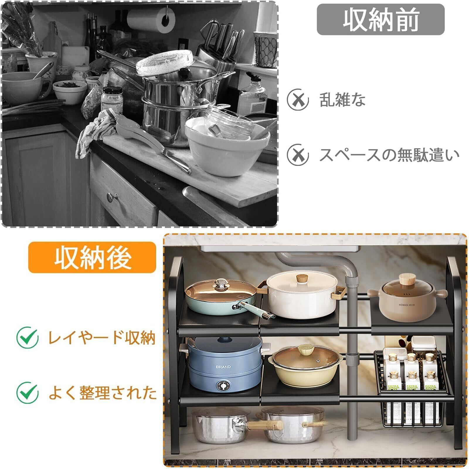 ✅優良な品質、耐久性、お手入れ簡単:品質と耐久性に悩んでいませんか?シンク下ラック品質と実用性を兼ね備え。厚手の炭素鋼とPP素材を使用し、強度と安定性が大幅に向上し、重い荷物でも変形しません。耐磨性、防刮、防水防錆、湿った環境でも長期間使用できます。取り外し可能な棚と収納バスケットは簡単に外して外部で洗うことができ、汚れやほこりを素早く取り除き、棚をいつも清潔に保つことができます。