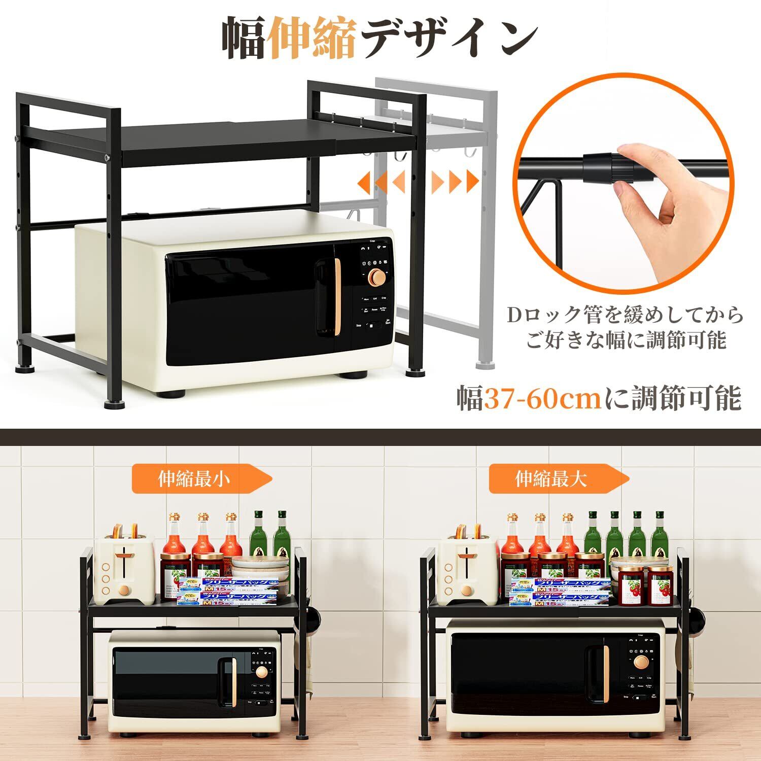 BESONTキッチンラック レンジ台 レンジラック 幅伸縮可(41-60cm)高さ3段調節 三つフック付き (ブラックM)