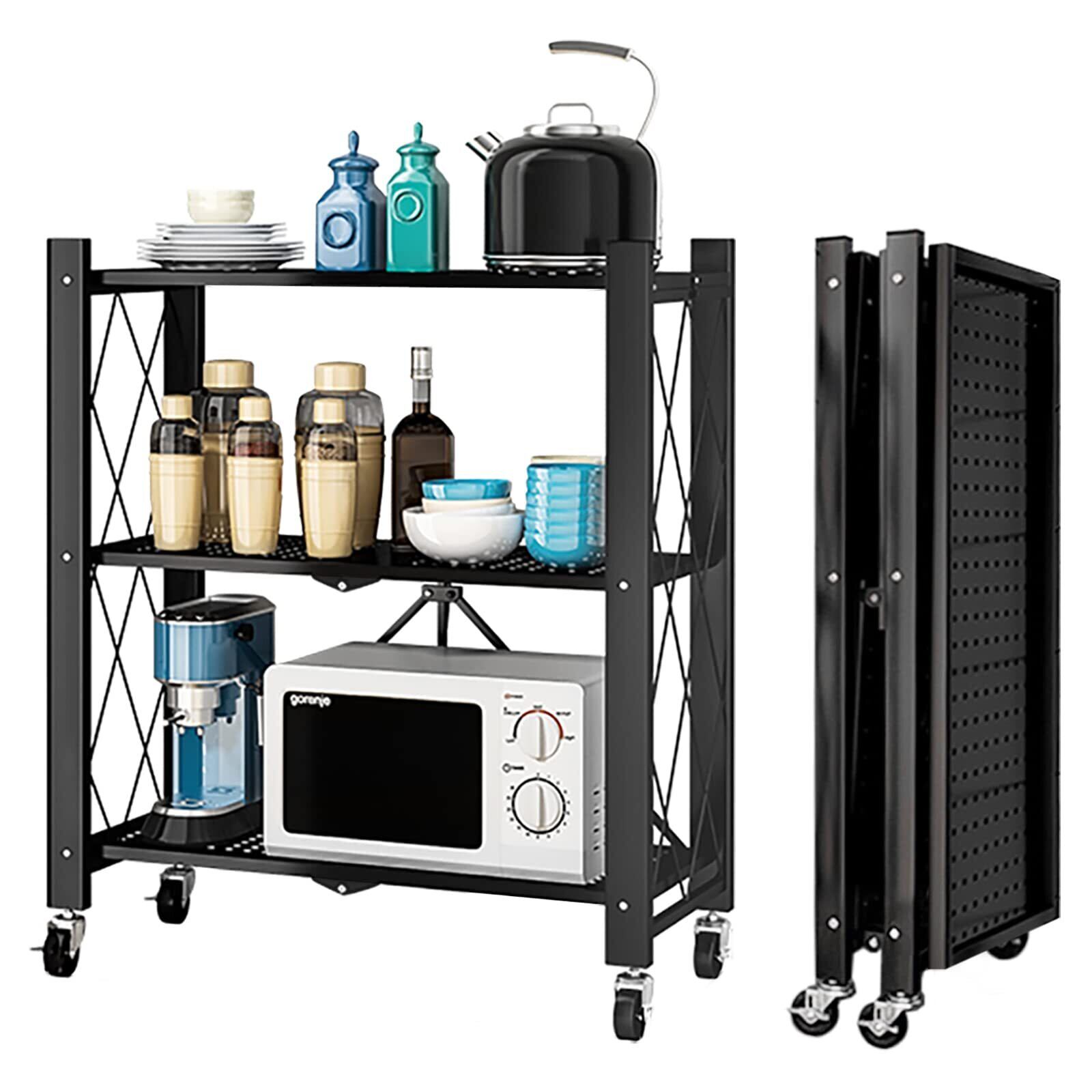 NEKOU メタルラック 折りたたみラック 3段 大容量 収納ラック キャスター付き キッチンラック レンジラック 防サビ加工 オープンラック 移動便利 組立簡単 折りたたみ収納 キッチン家庭用 業務用