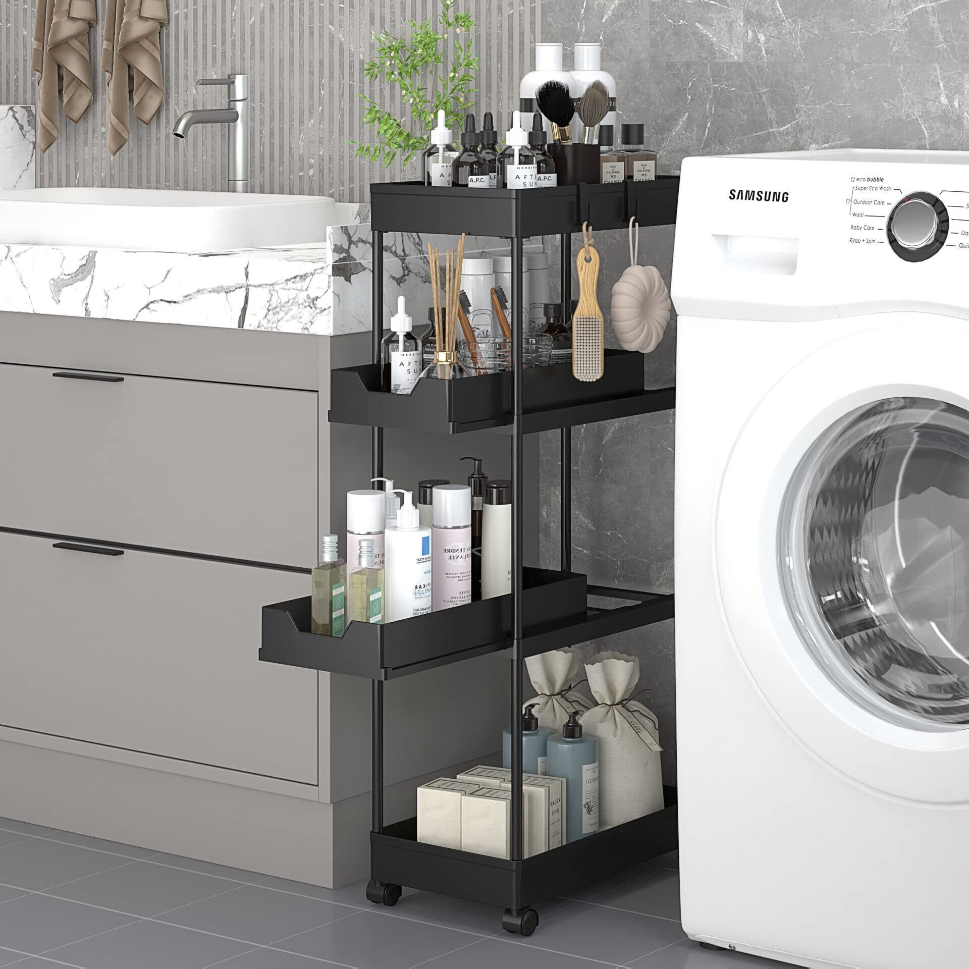 Melody House キッチンワゴン 4段 キッチン隙間収納ワゴン 隙間収納 キャスター付き 引き出し付き スライド式 収納ワゴン スリム 調味料ラック 台所収納 組立簡単 浴室 台所 棚 移動式 ブラック