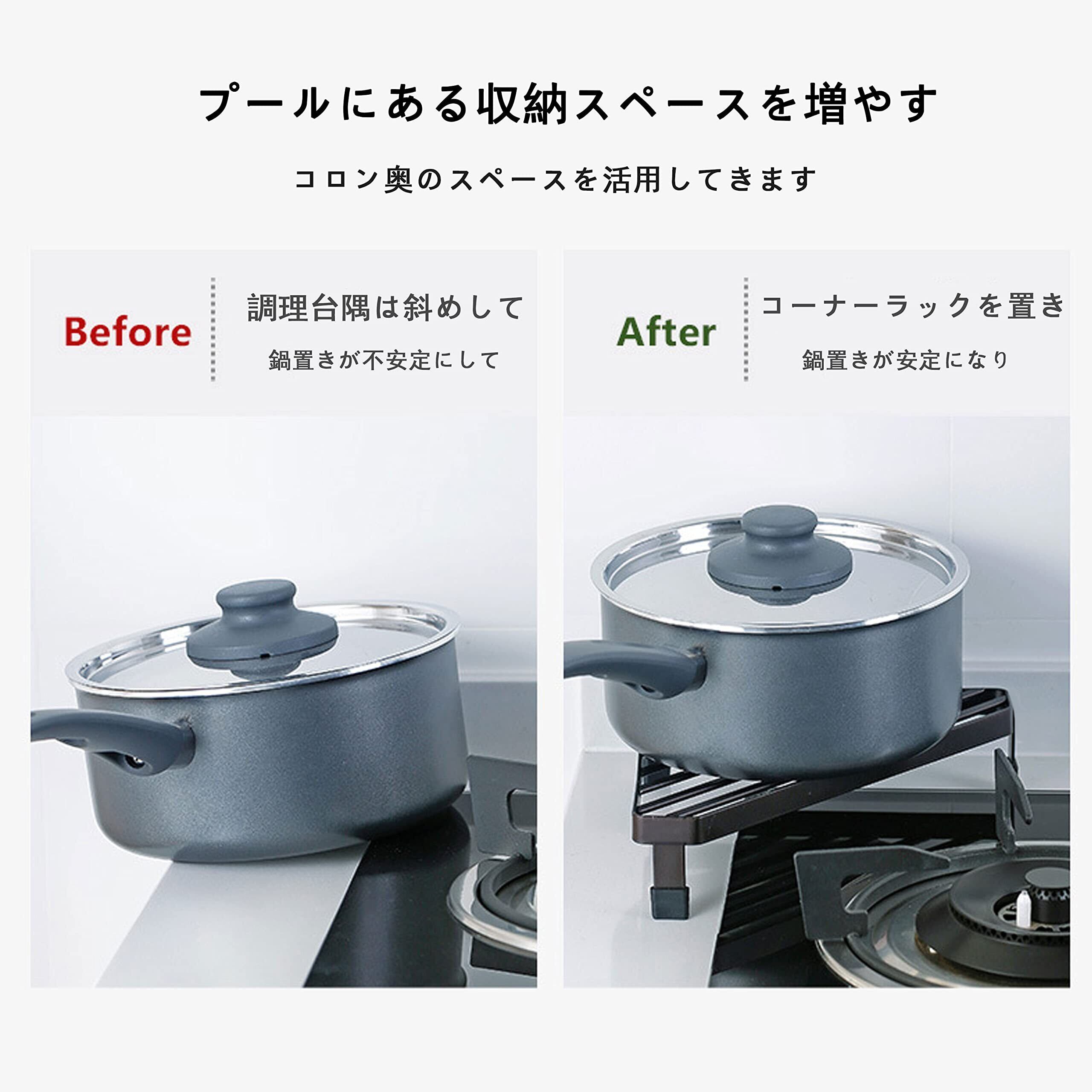 コンロコーナーラック コンロ奥ラック キッチンコーナーラック 三角コーナー 鍋収納ラック 鍋置き フライパン置き フライパンラック 水切り スペースの節約 キッチン 台所 ブラック HOGAWAY