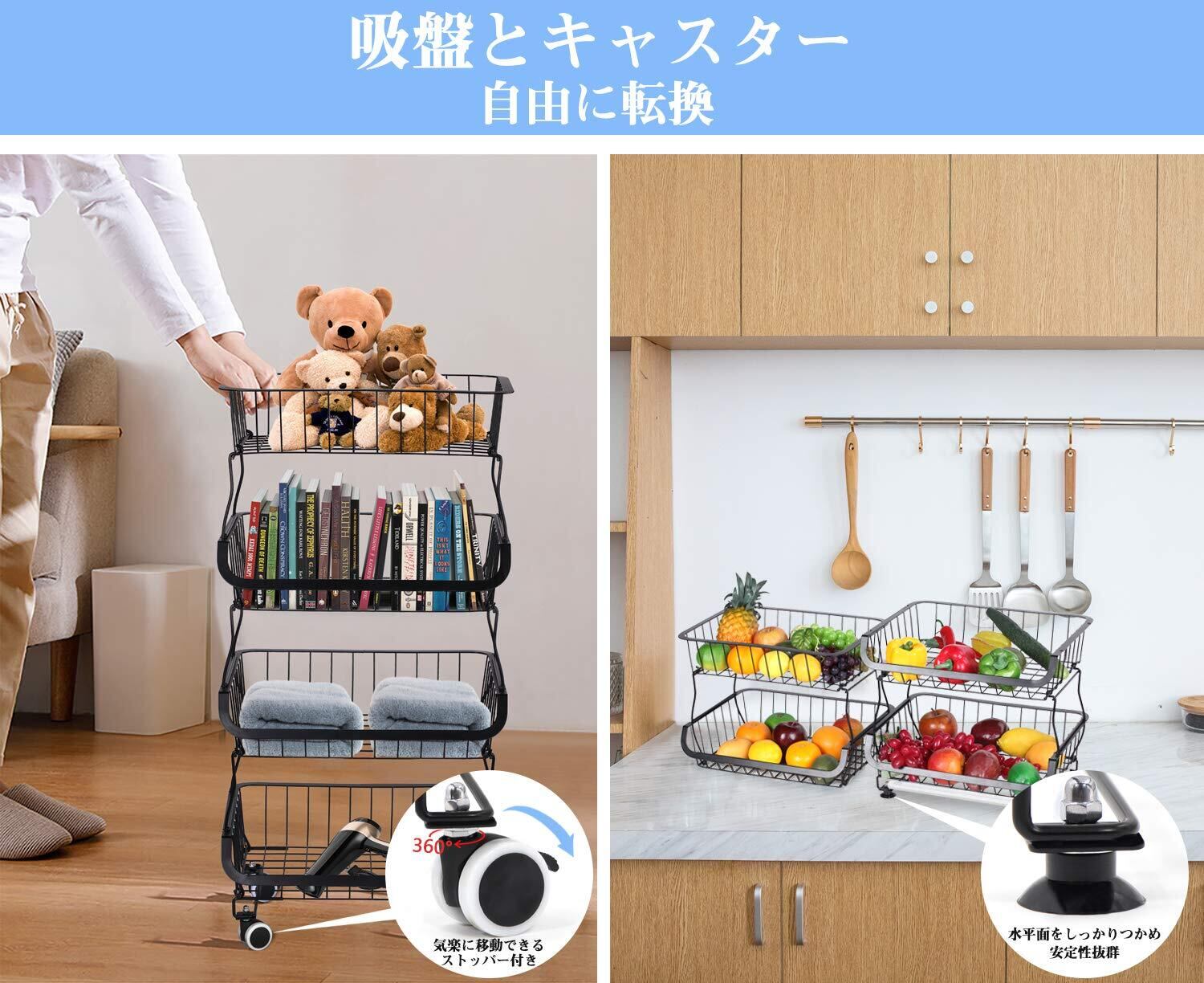 【スタッキング式、1段から4段へ変身】キッチンワゴンと言ったら、何を思い出しますか。きっと、四つキャスター付き、バスケットは固定であるのだろう?こちらのワゴンを見て、伝統を突破しました! スタッキング式で、キッチンワゴンの段の数を決めます!1段か、2段か、三段か、4段か、全て自分次第、自由に組み立てる可能となってます。残るバスケットがあれば、収納ボックスとして、ランドリーバスケットとして、新聞や玩具、本、服、タオル、洗濯物などをきっちりと収納できます。