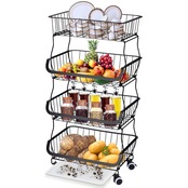 Brusmo キッチンワゴン トレイ付属 キャスター付き 4 段 スタッキング式 バスケット 調味料/皿/野菜/服収納 洗濯室 バルコニー 多機能ランドリー収納 工具付き ブラック (黑)