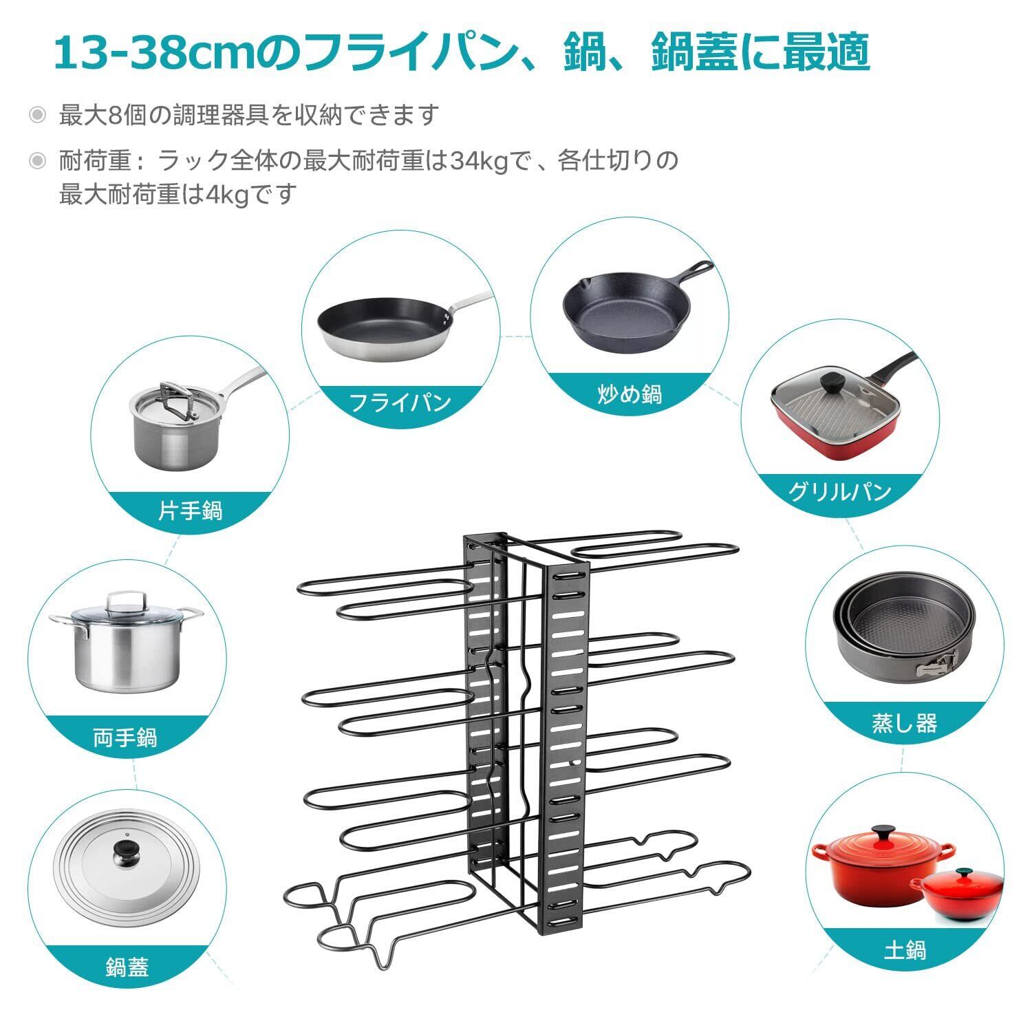 HASONA フライパンスタンド (8仕切り フライパンラック フック4個付き) 鍋 フライパン 収納 スタンド 3インストール方法 鍋蓋 縦置 横置 高さ調整可能 省スペース 防錆 耐熱 ブラック