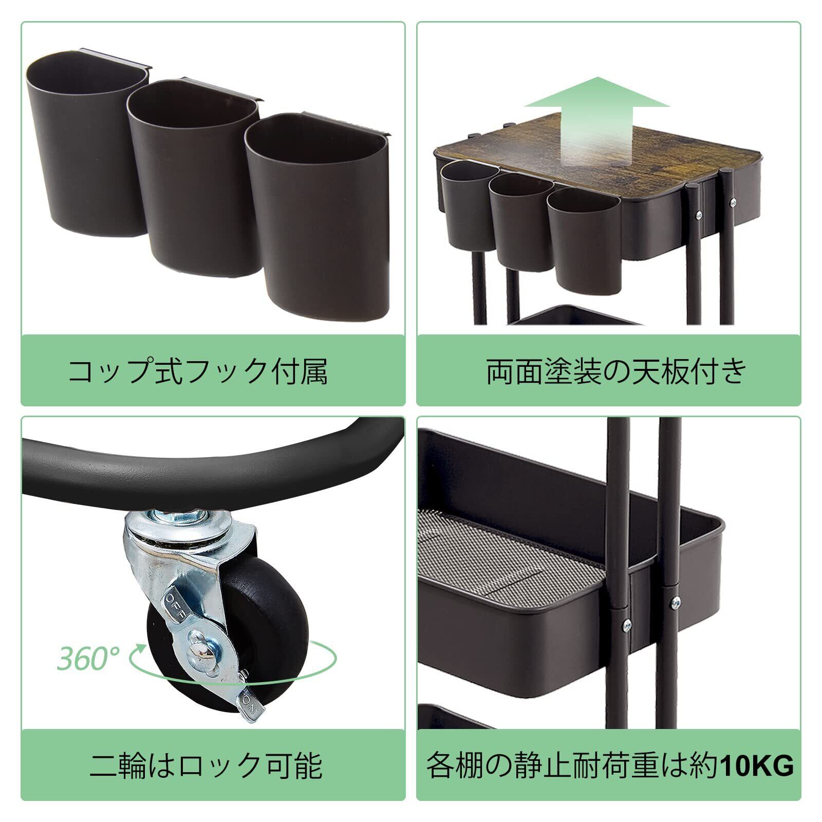 Melody House キッチンワゴン 3段 天板 キッチン ワゴン バスケットラック トローリー キッチン収納カート キャスター付き 組立簡単 収納カップ おしゃれ 隙間収納 台所 収納棚 小物収納 浴室 ブラック