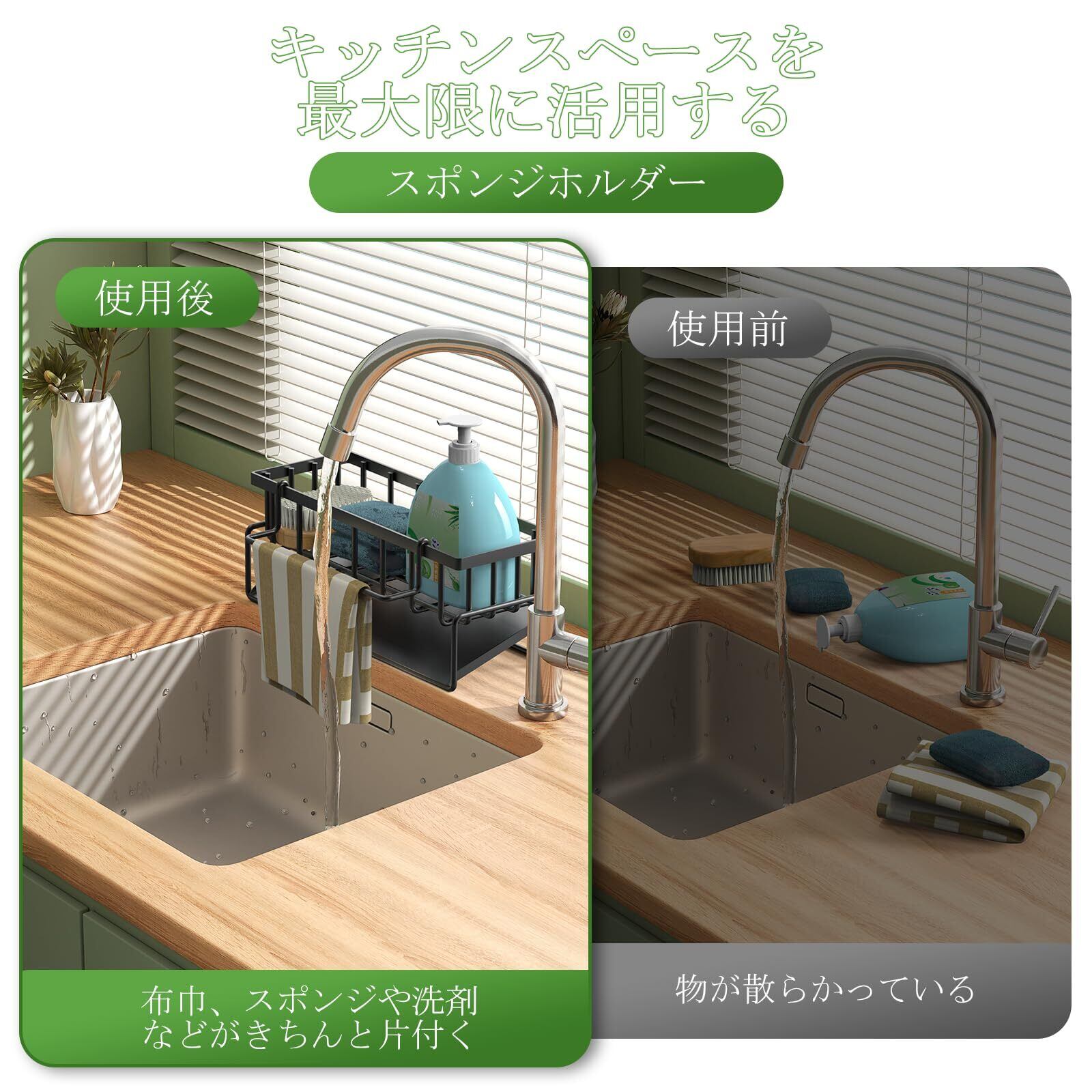 Feestars スポンジ置き スポンジホルダー スポンジラック 取り外せる布巾掛け付き 斜め水切りトレイ 耐磨耗 防錆 耐熱 キッチン/シンク/台所/洗面台などの収納 キッチン用品 便利 人気(ブラック)