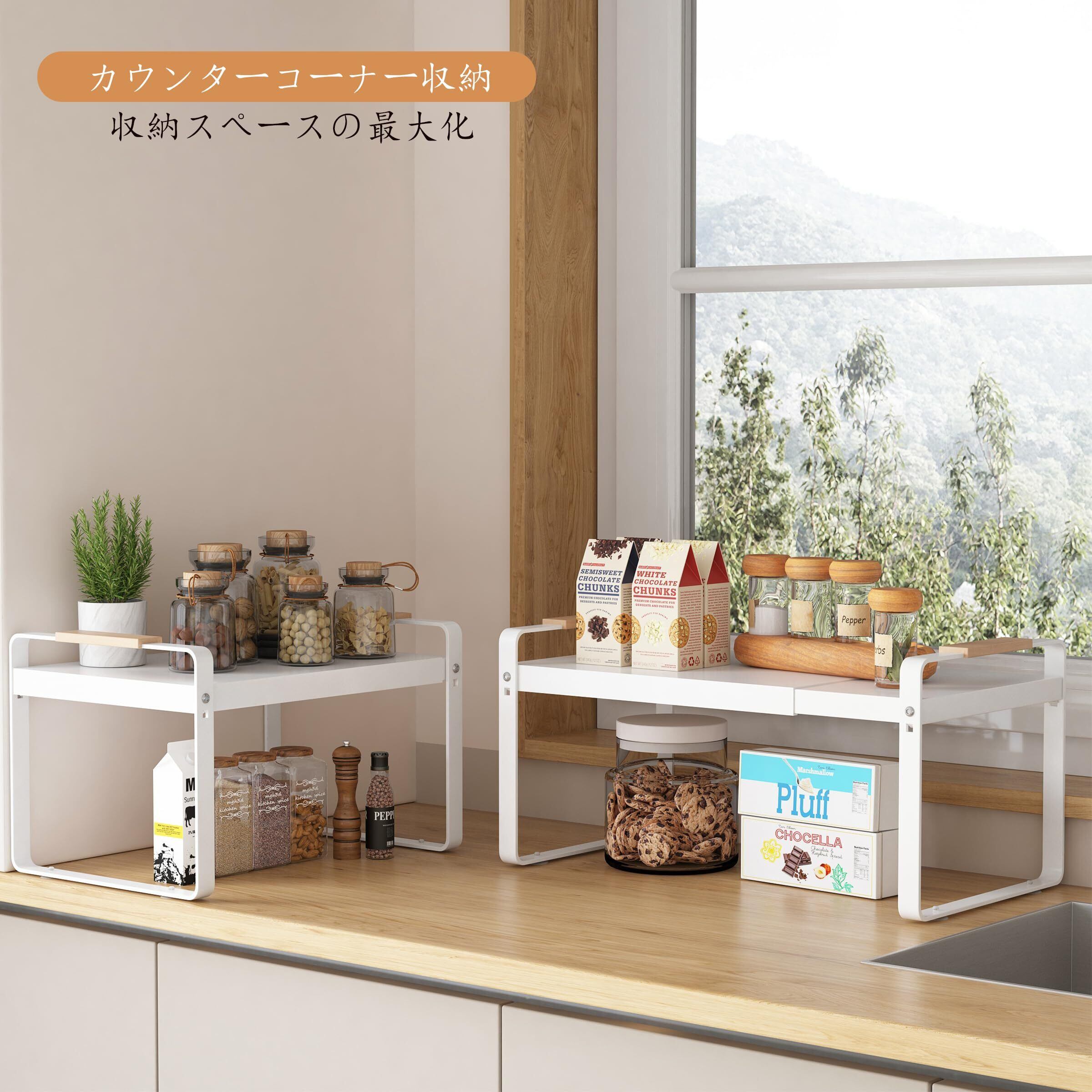 長さ調節可能:キッチンシェルフは収納式なので、お好みやキッチンのレイアウトに合わせて長さを調節できます。これにより、さまざまなサイズのキッチン用品を収納できます。