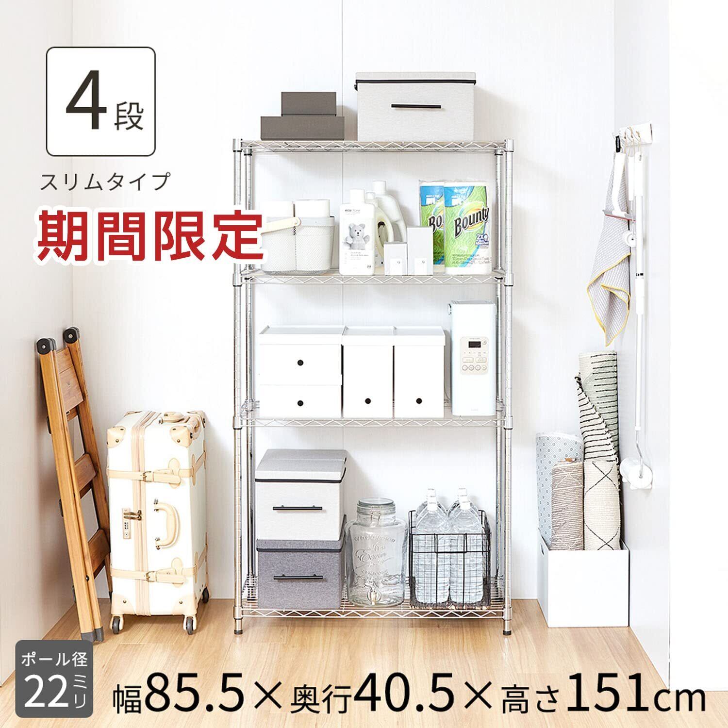 ドウシシャ ラック スチールラック 棚 4段 収納 幅85.5×奥行40.5×高さ151cm 全体耐荷重260kg 軽量 スリム スチールシェルフ キッチンラック レンジ台 キッチン収納 納戸 押し入れ収納 衣類収納 ポール径22mm WR22-85154