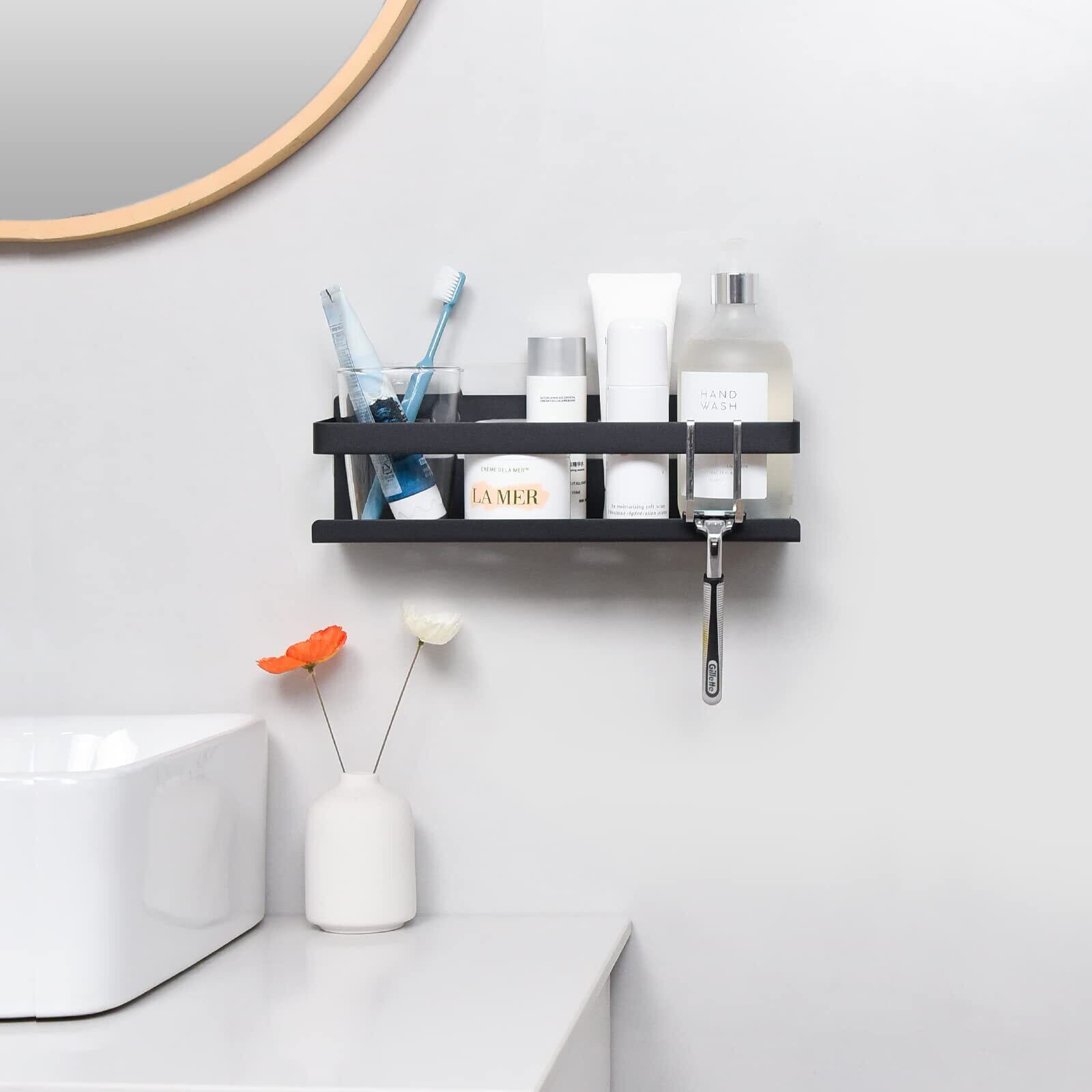 バスルーム ラック ブラック 浴室用ラック 強力粘着 浴室収納 フック付き(30CM-粘着-黑)