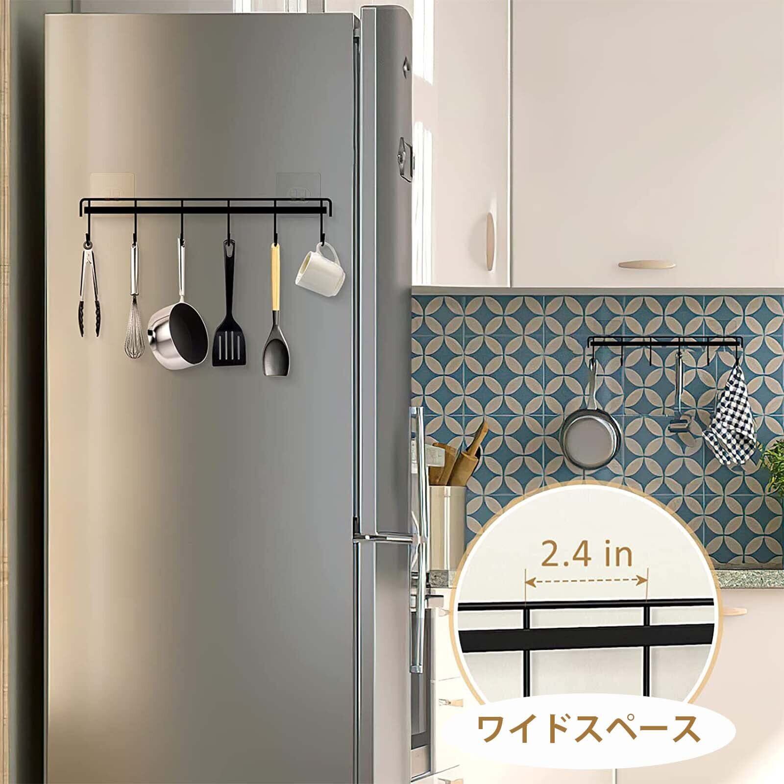 【手の届くところに】調理器具を簡単に弔るしたり、取り出したりできるように、各フックは適切な間隔で設計されており、横棒の上に固定されています。2粘着性のある接着剤は強く安定しており、器具のレールハンガーの揺れを防ぎます。