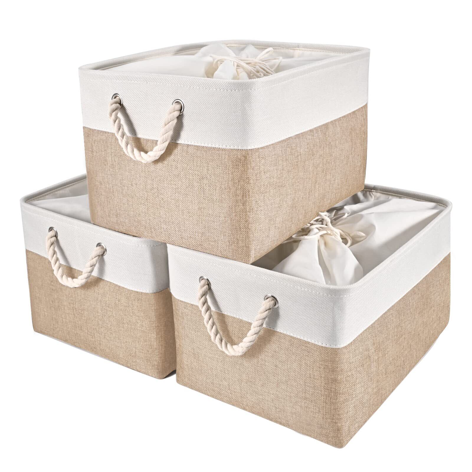 【Amazon.co.jp 限定】STVICTORY 収納バスケット 収納かご 3個セット 40×30×24cm 無臭 巾着 取っ手付き オシャレな収納ボックス ランドリーバスケット ストレージバスケット 布 洗濯かご インテリア雑貨 衣類 小物収納 引き出し 折り畳み式 綿麻製 防水 防湿 防塵 高耐久性 長方形 (ホワイトベージュ)