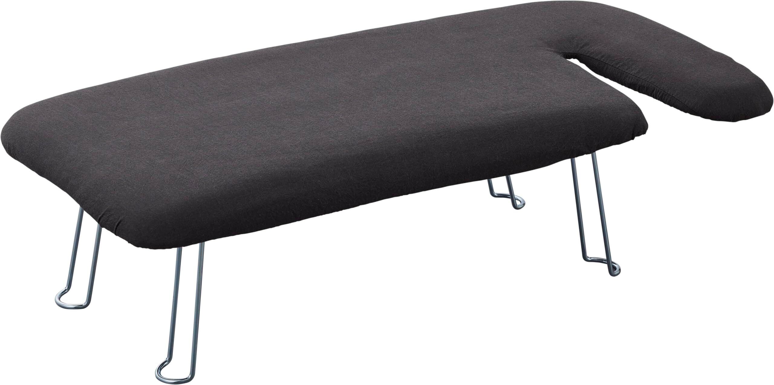 品質表示:表面布:綿100% クッション材:ポリエステル 天板:スチール(粉体塗装) 脚部・フック:スチール(ユニクロメッキ) ボタンプレスゾーン(凹凸吸収クッション):ポリウレタンフォーム