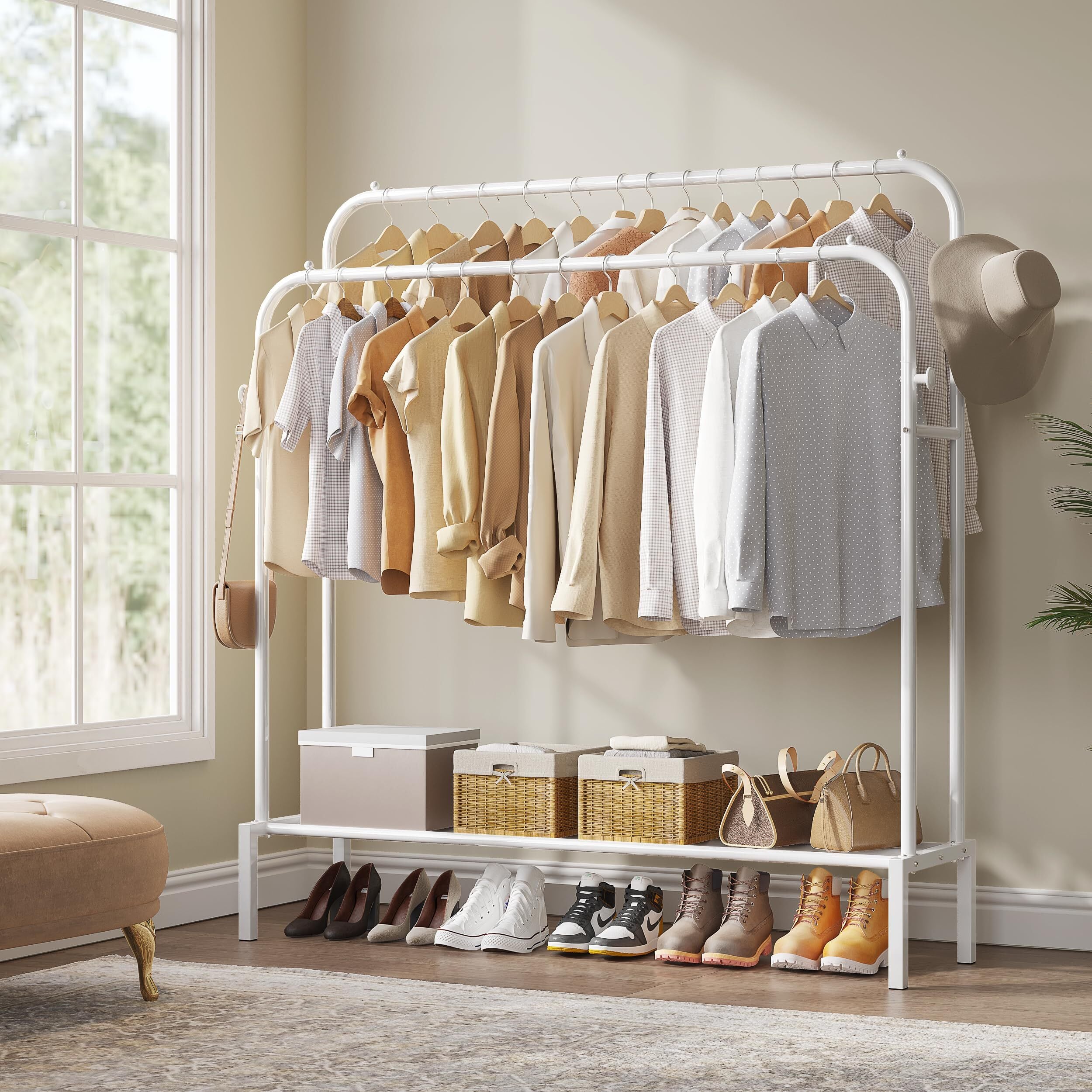 【ストレージ容量のアップグレード】このハンガーラックは2本のポールを備え、1本のポールを備え少なくとも25kgの衣類を掛けることができ、40枚以上の衣類を自由に掛けることができます。さらに収納棚が1段、ハンガーラックの全高を141.5 cmに高め、コートを掛けやすくしました。総荷重は70kgと高く、大量の衣類やアクセサリーを簡単に収納できます。
