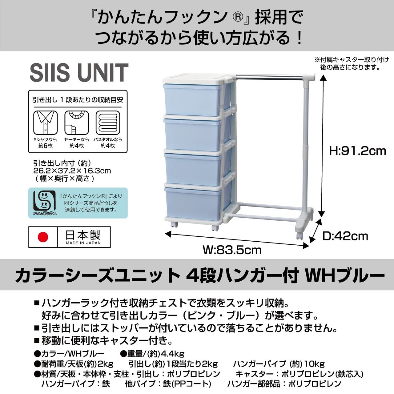 JEJ SEEDS(シーズ) ハンガーラック & 4段チェスト セット ブルー SIU-4-BL-H