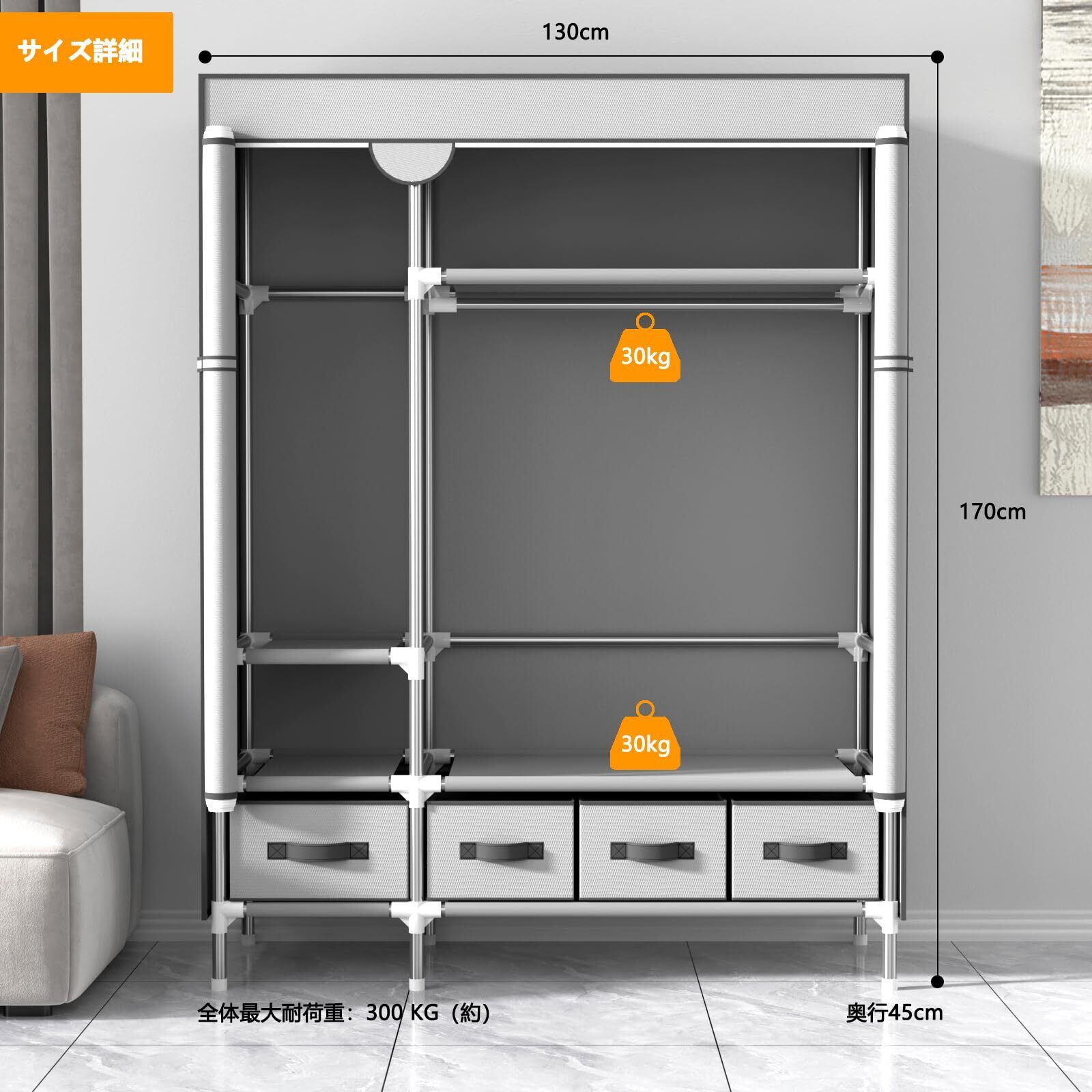ワードローブ カバー付き クローゼット 引き出し4つ付き 大容量 収納 おしゃれ 不織布 簡単組み立て 多機能 ハンガーラック 収納棚 耐久 頑丈 防水 防塵 防汚 省スペース 幅130×奥行45×高さ170cm (ライトグレー)