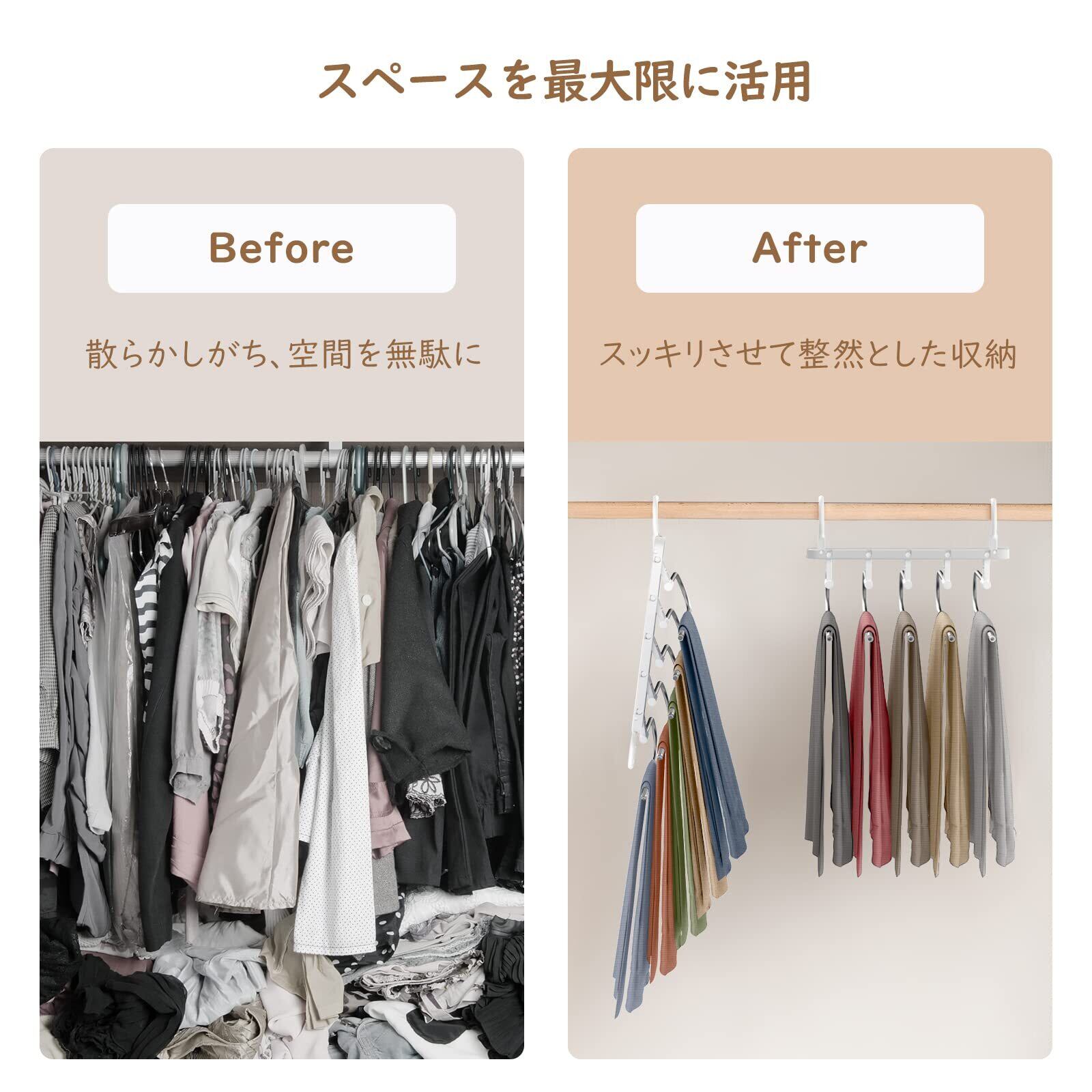 「縦と横の2つパタンの掛け方」 面倒なクリップの扱いが不要で、縦と横のどちらでも使用できる5連タイプのハンガーより、クローゼットの空間元の5分の1になります。縦のパターンではズボンが重なり畳んで収納可能で、クローゼット内をスッキリとさせることになり、ズボンをかけることや取り出しの際に、空間を空いた収納と取り出も扱いやすい横のパターンに変更して、より快適に行えるようになります。