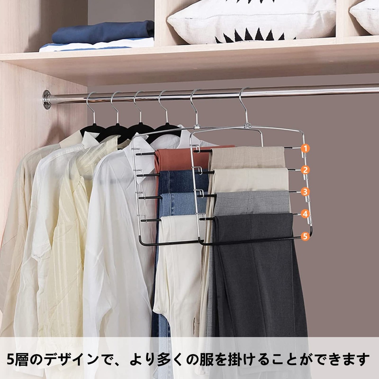 【5段ハンガー】このステンレスハンガーは5段に設計し、一本のハンガーで5枚のズボンを収納できるのでクローゼット内のスペースを有効活用し、ズボンがきれいに整理整頓することができます。