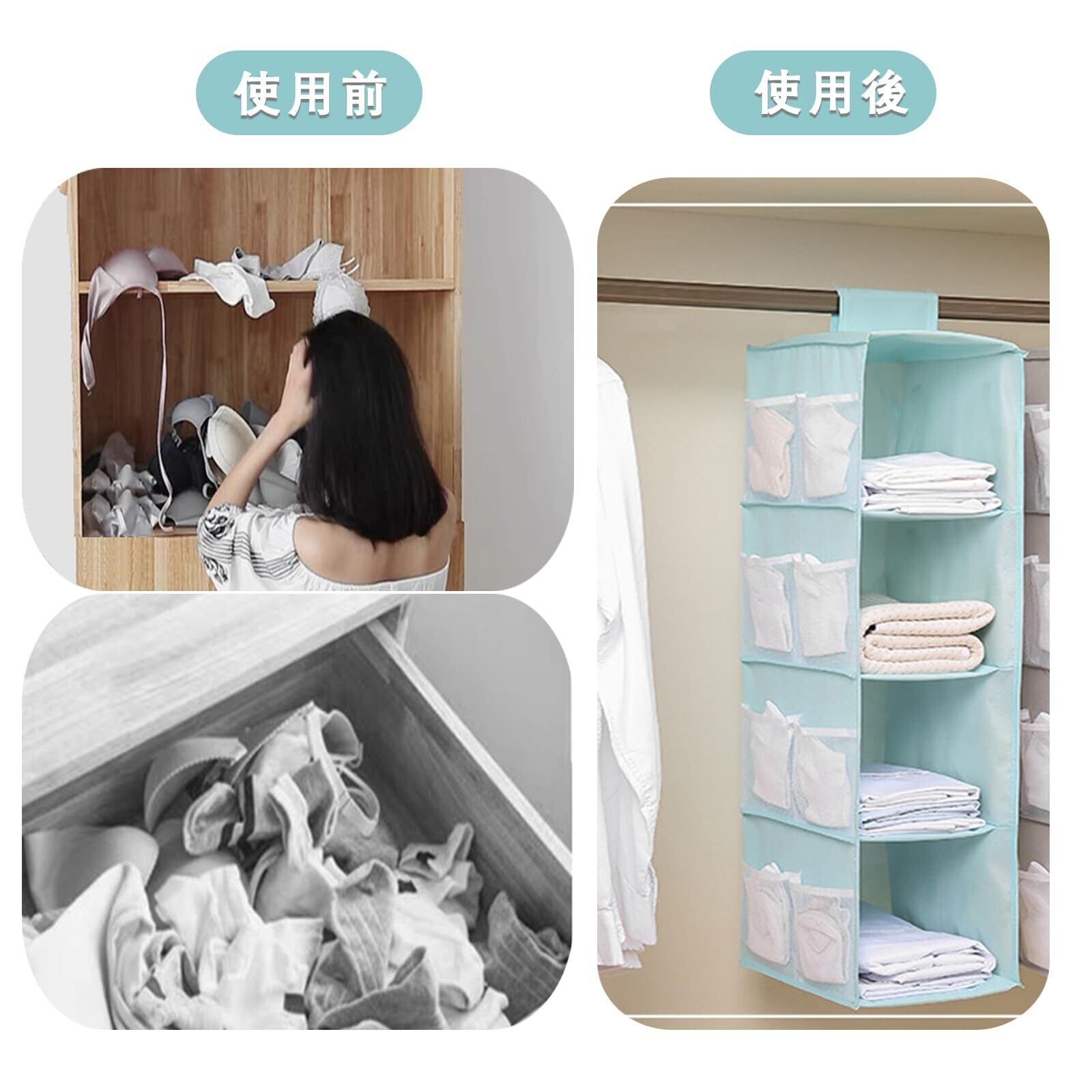 【収納力抜群】見やすく取り出しやすい4段で大容量の吊り下げ収納ラック、収納の心強い味方、両側にブラーや靴下などの12ポケット付き、幅広なので、収納力も抜群です。クローゼットのロッドに掛ける、だけ小物類からジーンズやベルト、帽子、靴箱迄収納られます。お好き次第自由にご愛用頂けます、毎日服を選ぶのが楽しくなります。