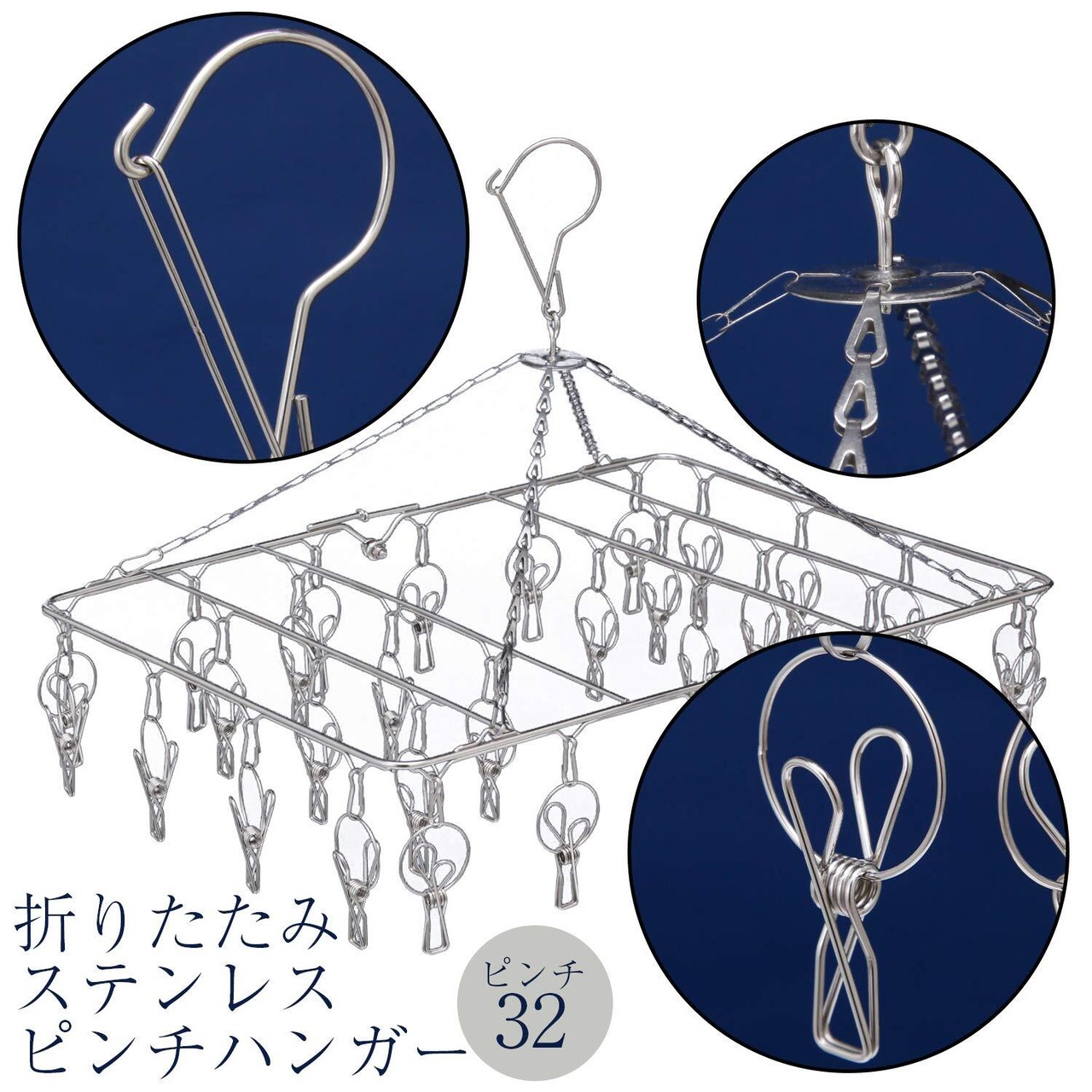 折りたたみステンレスピンチハンガー 32個 洗濯物 干す 洗濯ばさみ サビに強い 角型