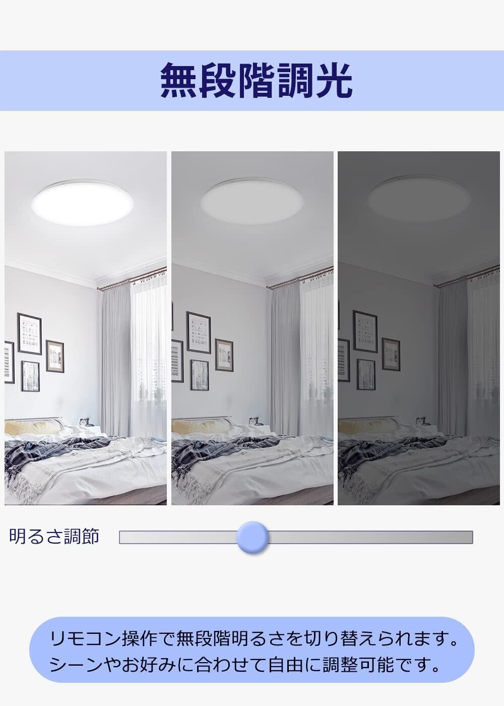 【リモコン付き・無段階調光】LEDシーリングライトは全方位制御できる便利なリモコンが付きます。リモコン操作でライトの明るさが無段階調整可能です。「明るく」あるいは「暗く」ボタンを押すごとに、ワンランクで明るさを調節できます。2秒以上長押すと、無段階連続調光できます。「全灯」ボタンも搭載、素早く最大輝度に調整できます。リモコンホルダー付き、 リモコンを壁に固定して 探しやすいです。