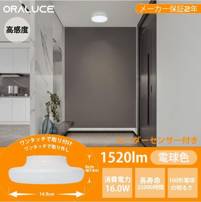 ORALUCE センサー付 シーリングライト 小型 電球色 16W 1520lm 高感度レーダーセンサー 照明器具 天井 取付簡単 廊下/玄関/洗面所/トイレ LEDライト おしゃれ Ra82演色性 長寿命 節電対策 SCL16L-R01