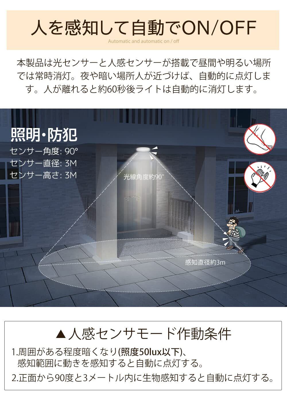 【人感センサーライト】本製品は光センサーと人感センサーが搭載で昼間や明るい場所では常時消灯。夜や暗い場所(照度50lux以下)人が近づけば、自動的に点灯します。人が離れると約60秒後にライトが自動的に消灯します。【ご注意:初期設定が完了したら、スイッチをオンにすると、約2秒後にライトが消灯になります。 この機能は灯具が正しく設定されるため、その後人感センサーモードが待機状態になります。スイッチが常にオンになるようにご確認してください。】