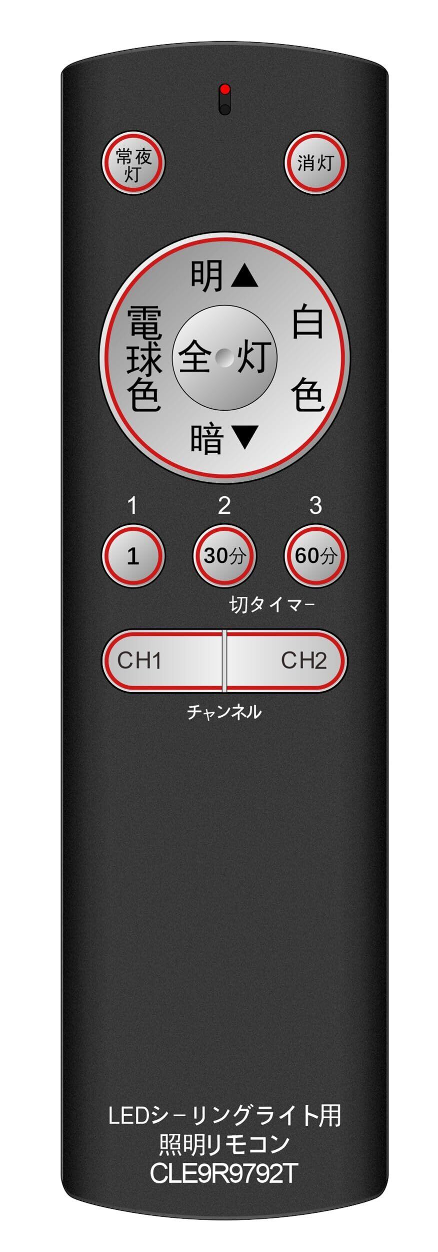◆この 照明リモコン 調光(明/暗)ボタン、調色(寒色/暖色)ボタン,全灯・消灯・常夜灯 ボタン,30分・60分 オフタイマーボタン付き,大きなボタンで便利。※単4形乾電池×2本(別売)