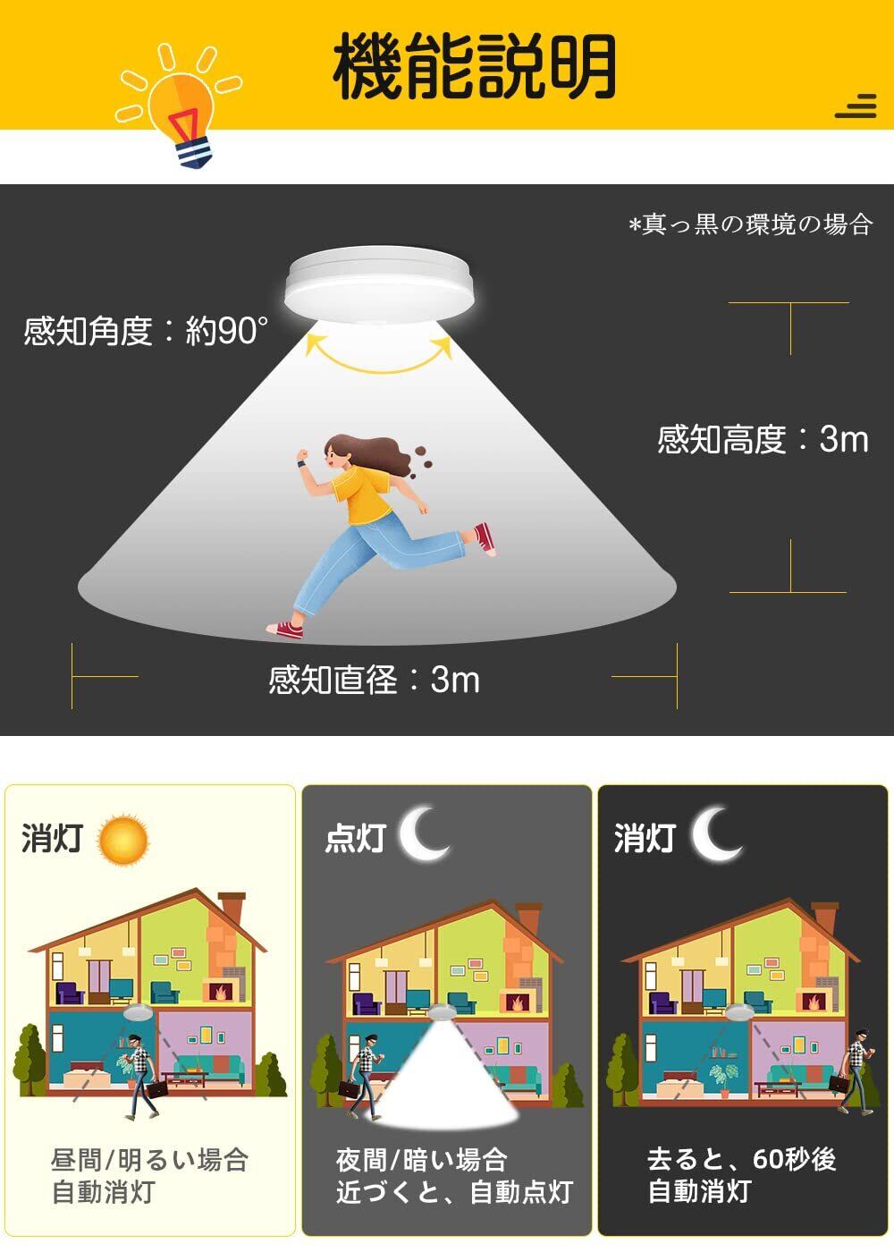 【人感センサー付き】赤外線センサーと光センサーを搭載し、感知距離は約3mです。夜間/暗い場合(明るさ≤50Lux)、ライトに近づくと自動点灯になります。感知範囲から離れると、約60秒後、自動消灯になります。【ご注意:初期設定が完了したら、スイッチをオンにすると、約2秒後にライトが消灯になります。 この機能は灯具が正しく設定されるため、その後人感センサーモードが待機状態になります。スイッチが常にオンになるようにご確認してください。】