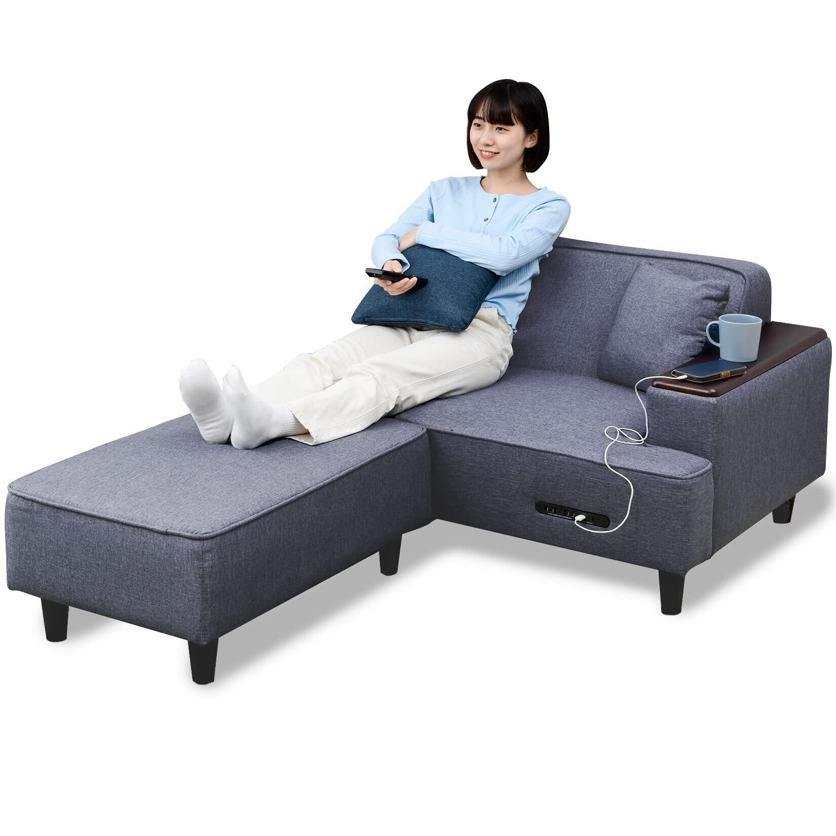 [山善] ソファ (カウチソファ) 2人掛け 木製肘掛け/2口コンセント/USBポート/クッション2個付き ロボット掃除機が通れる レイアウト自由 幅110㎝ オットマン かんたん組立 グレー FHS-160TE (GY)