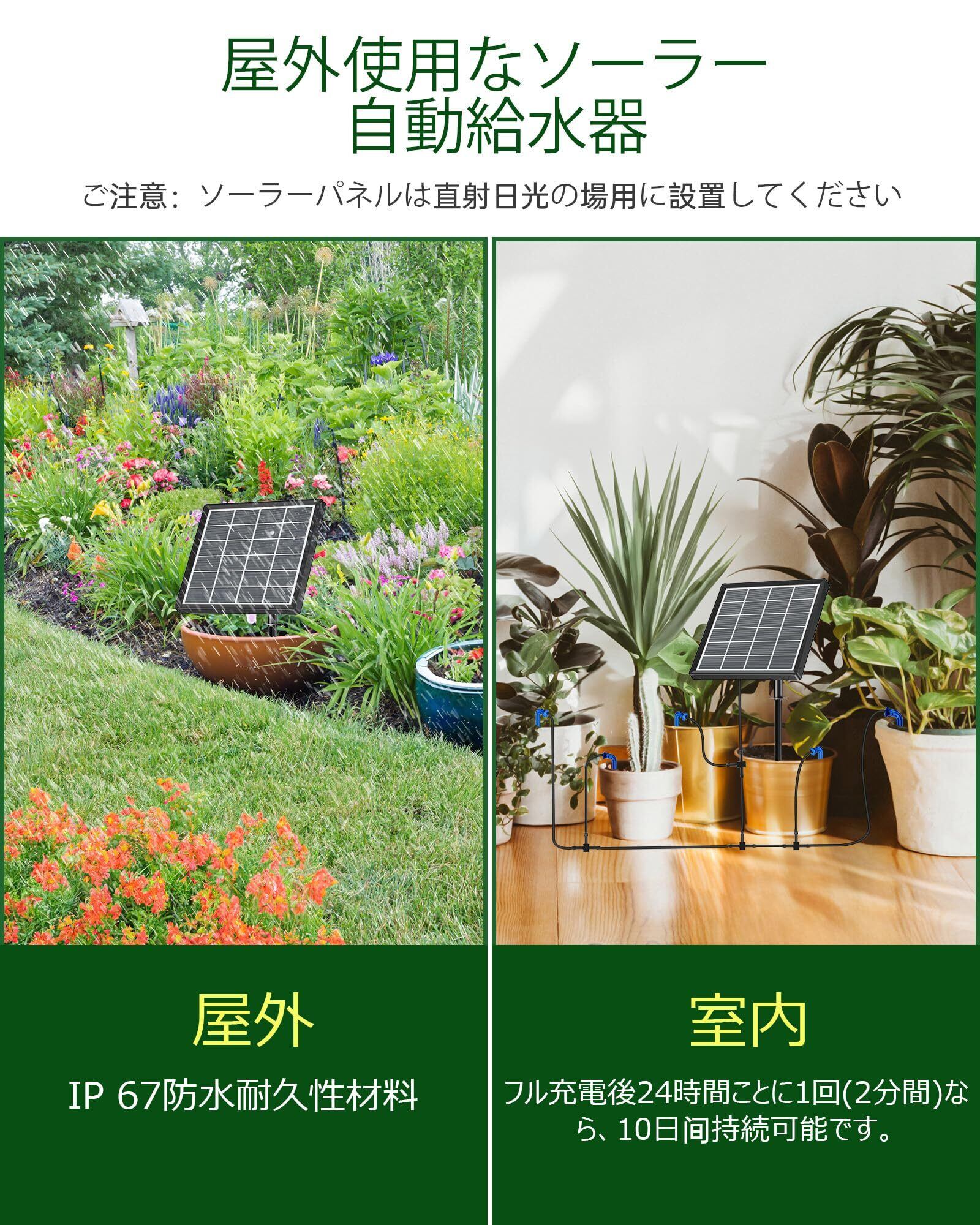 【操作が簡単で高機能】当該自動給水器は給水スケジュールができるから、便利でエコです。給水モードを設定すれば、最適な水やりができます。ソーラーパネルは二つの取付方法があります。壁に取り付けても、地中に差し込んでも、ご使用の空間に合わせて選ぶことができます。