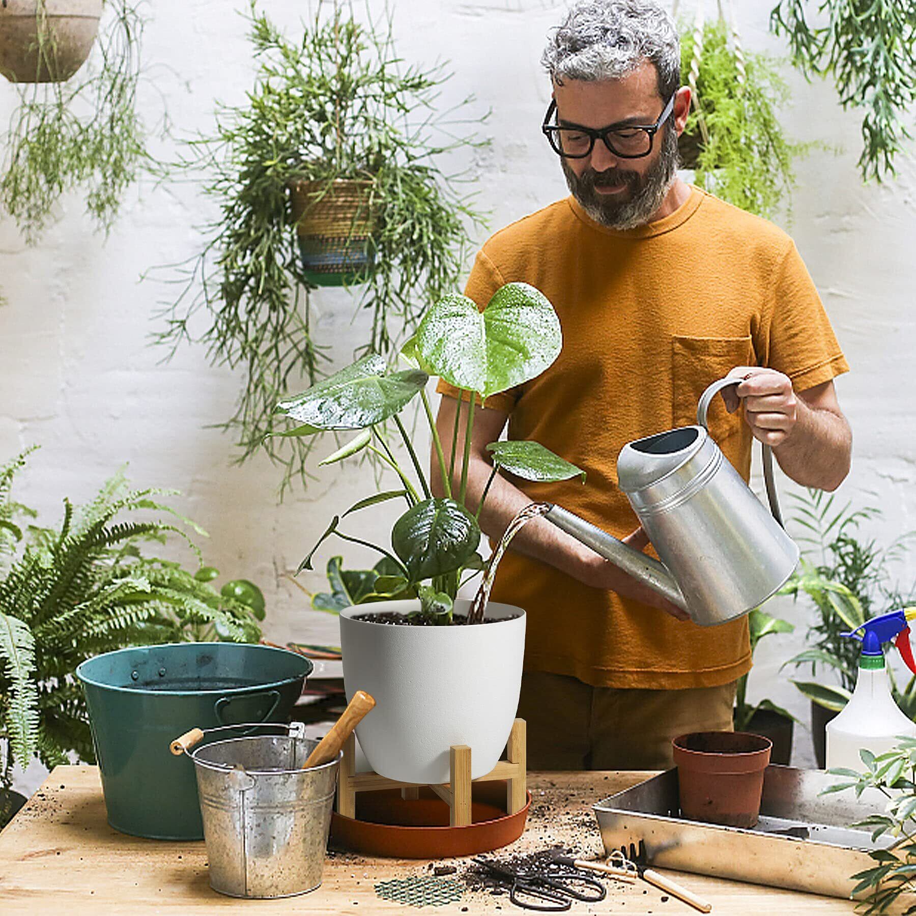 【上質な材質】優れた樹脂を採用されて、軽くて変形しにくくて、ひびが入りにくい観葉植物プランターです。スタンドも丈夫で、盆栽や鉢植えを楽に置くことができます。
