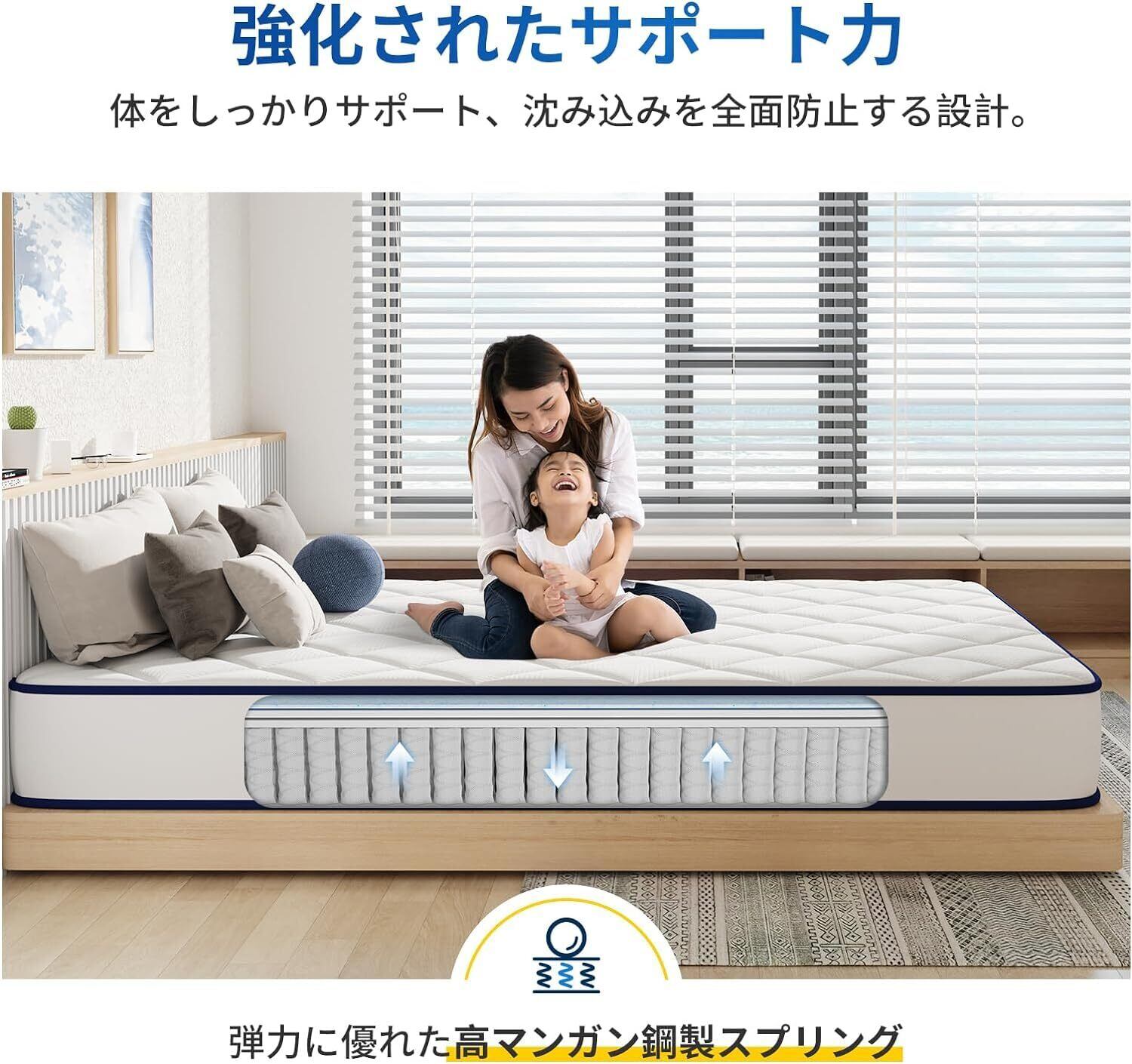 【独立ポケットコイルで安眠できる】ポッケトコイルマットレスは連続独立したポケットコイルを採用、独立したコイルで頭、肩、背中や腰などの身体部位を支え、過度な沈み込みが防止できる上、しなやかに背骨のS字カーブにフィットしやすいです。2人寝る時も、寝返りなどの動きも隣の睡眠を影響することにならず、一晩中楽な睡眠を楽しむことが叶えます。