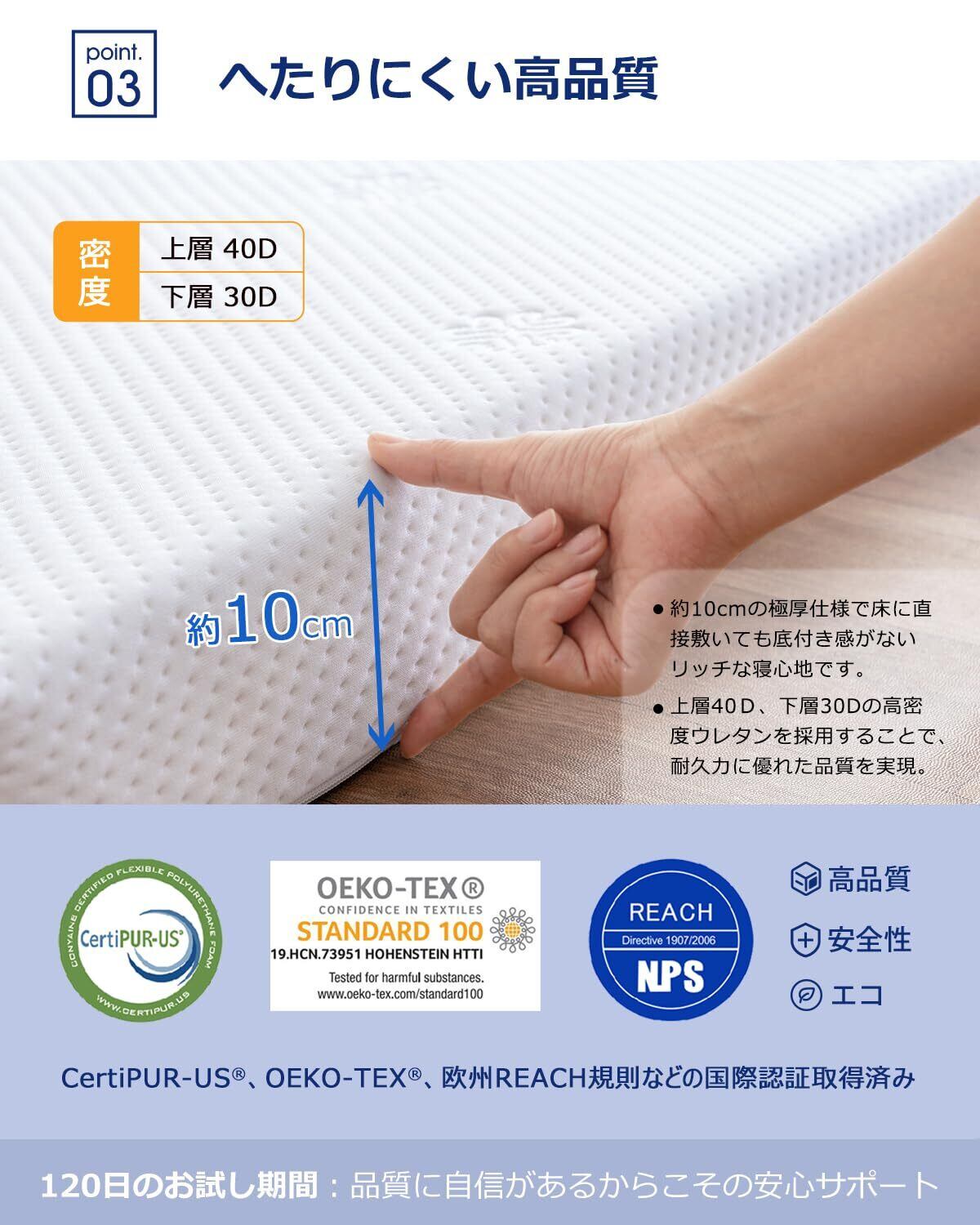 【リッチな寝心地】マットレスの厚みを約10cmにすることで、敷布団を必要とせず、畳や床に直接置いて使用する事が可能です。安定感のある高反発層は硬さ150Nもあり、横になった際に、体をふんわり押しあげてくれるようなリッチな寝心地となっています。朝までしっかり眠れる快眠マットレスです。