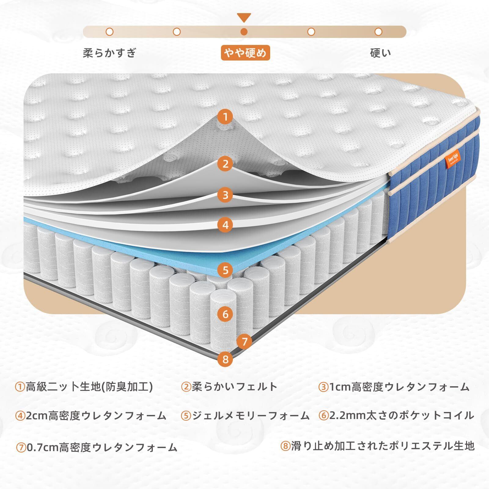 4.【21cmの厚みで抜群の安定感・底付き感なし】たっぷりの厚みが体を十分に支え、やや硬めの寝心地で沈み込みすぎず、底付き感もまったくなく、朝までぐっすり眠れます。ふわふわでふっくらとしたキルティング層は、肌に触れると雲のような柔らかな寝心地に包まれます。 厚さ16cmのポケットコイルは弾力性に富み、理想的な寝姿勢を保つことが可能です。更に、マットレス底部の高密度フォームがクッション効果を発揮し、マットレスの寿命を延ばし、より快適な寝心地をもたらします。