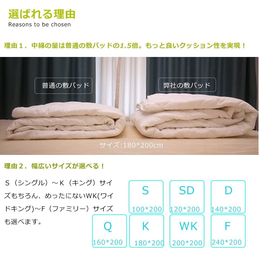 <もっと良いクッション性>:普通の敷パッドの1.5倍の中綿で充填して、ふんわり心地よい寝心地が実現できました。もっと良いクッション性と保温性が体験していただけます。