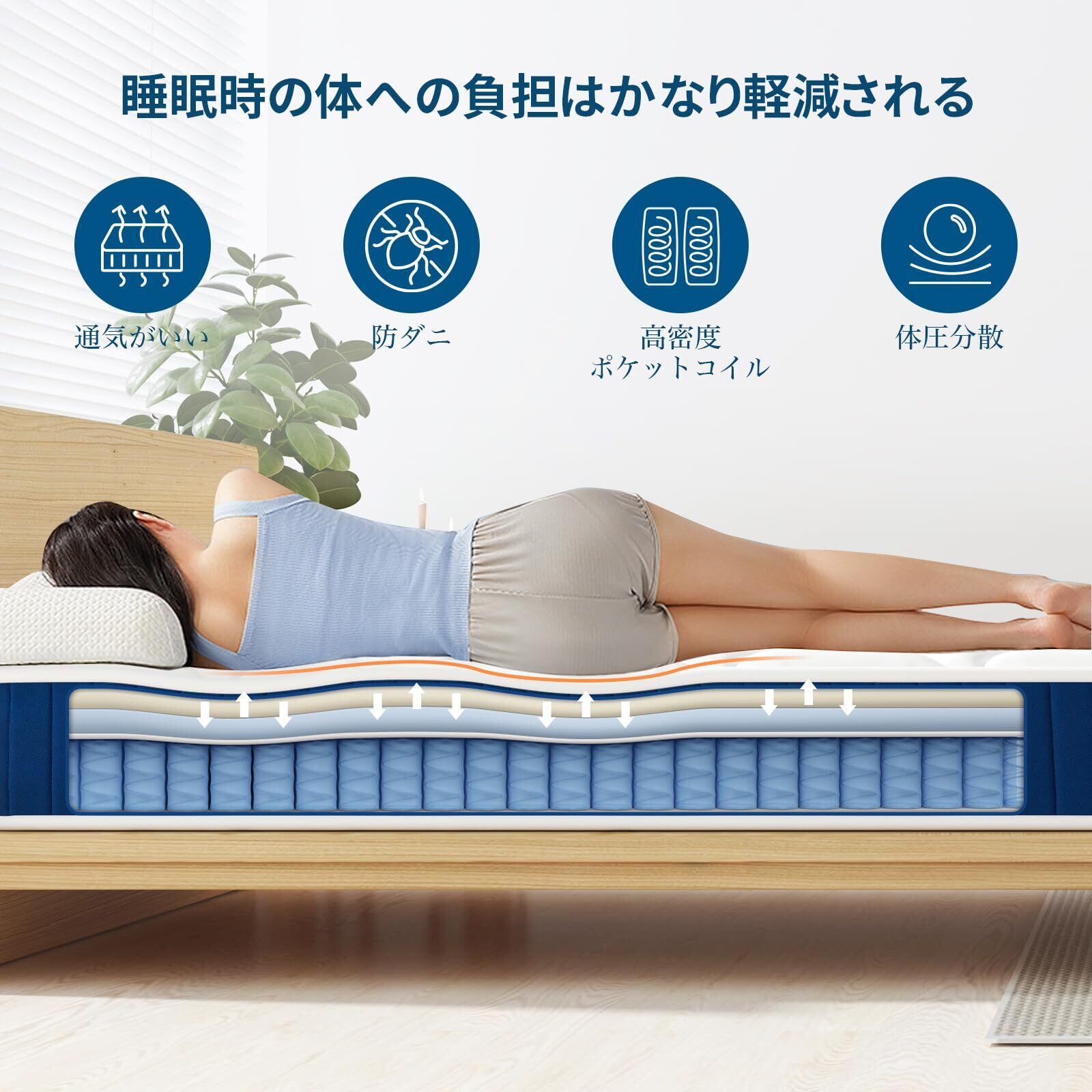 【極厚さ20cmで快適な睡眠】 高品質ポケットコイルで作成されたマットレスは、体圧を均等に分散させる優れた機能性があり、独立したコイルは体を細やかにサポートし、心地よいフィット感を提供します。マットレスは体をしっかり支え、余計の沈み込みを生じないため、より安定した寝心地が実現できます。また、ボリュームのある高密度ウレタンフォームを採用し、反発力が強く、ふんわりとした触感が体験できます。体重のある方が使用した場合にも底つき感を感じにくく、一度沈み込んでもすぐ元のきれいな状態に回復します。