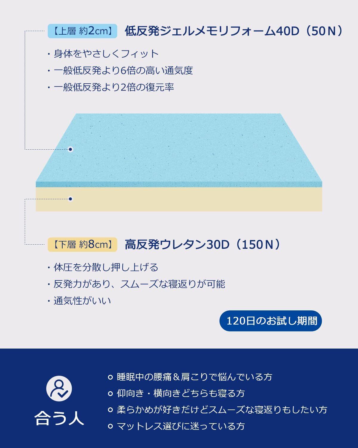 【リッチな寝心地】マットレスの厚みを約10cmにすることで、敷布団を必要とせず、畳や床に直接置いて使用する事が可能です。安定感のある高反発層は硬さ150Nもあり、横になった際に、体をふんわり押しあげてくれるようなリッチな寝心地となっています。朝までしっかり眠れる快眠マットレスです。